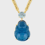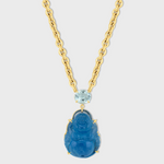 This handmade necklace features a serene Happy Buddha pendant carved from aquamarine, set in 14k gold with a matching aquamarine gemstone accent. Crafted in NYC, this elegant piece embodies tranquility and charm.