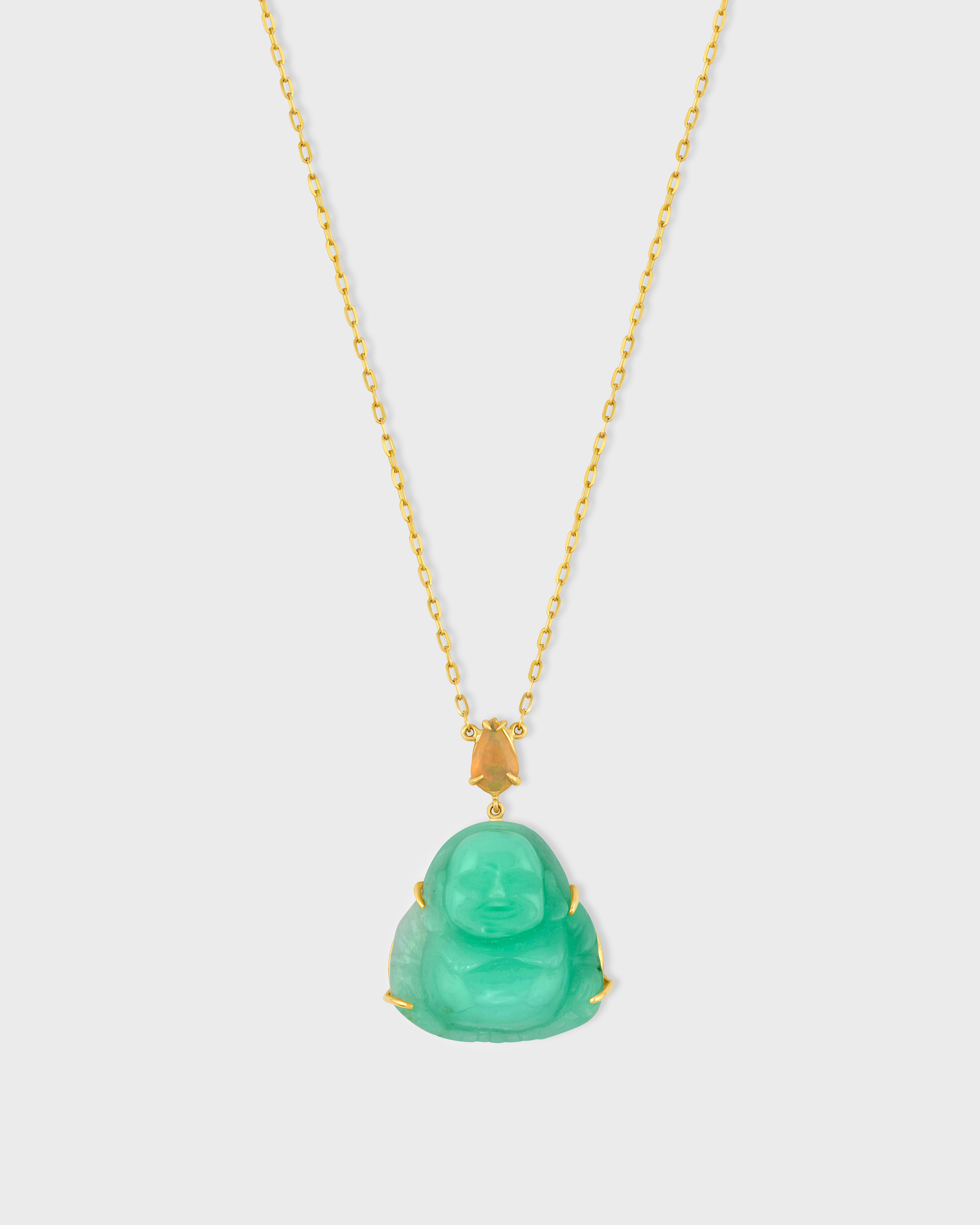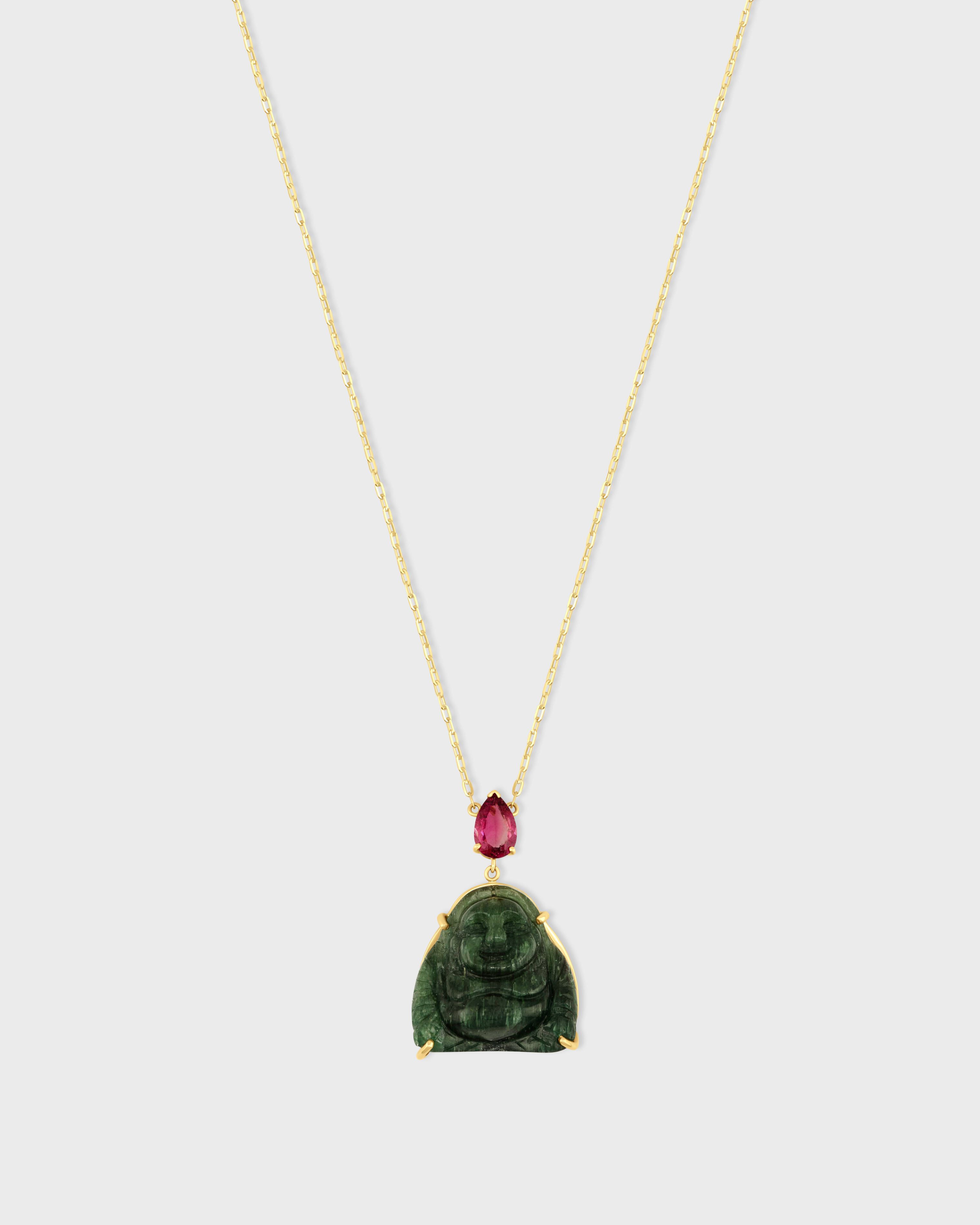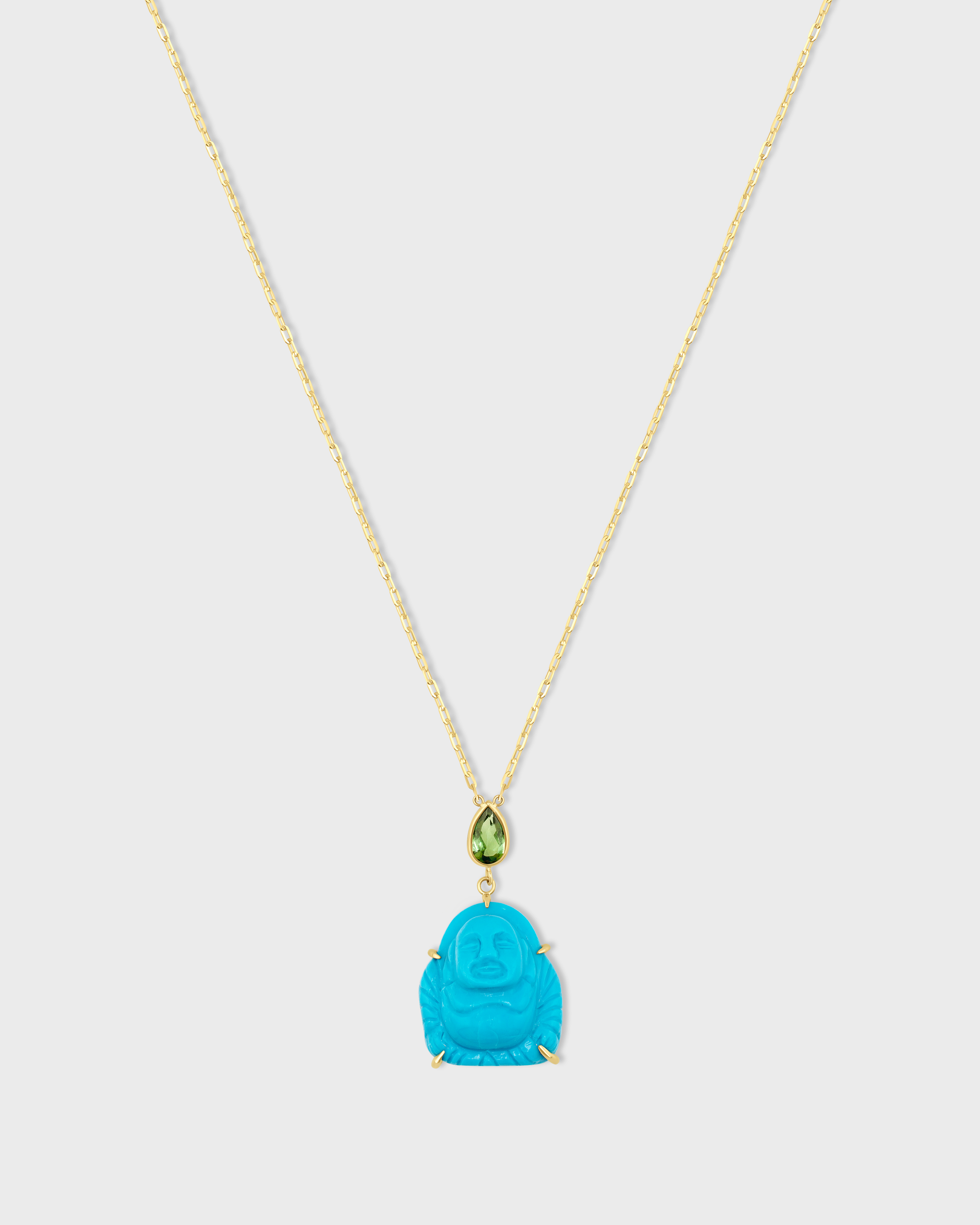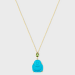 This exquisite turquoise happy Buddha pendant is meticulously crafted in NYC with 14k gold and features a beautiful tourmaline gemstone.
