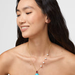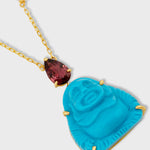 This charming necklace features a smiling Buddha pendant carved from turquoise gemstone, suspended from a delicate 14k gold and pearl chain. The Buddha is depicted with a serene expression and is adorned with a gemmy pink tourmaline crown. Turquoise is known for its beautiful blue-green hues and is believed to promote peace and tranquility. Tourmaline is believed to promote emotional well-being and inspiration. This necklace is handcrafted in NYC and is a perfect everyday piece that adds a touch of spiritual significance and positive vibes to any outfit.