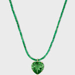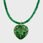 This piece features a stunning heart-shaped green amethyst gemstone pendant paired with emerald beads set in 14k Gold. Handcrafted in NYC.