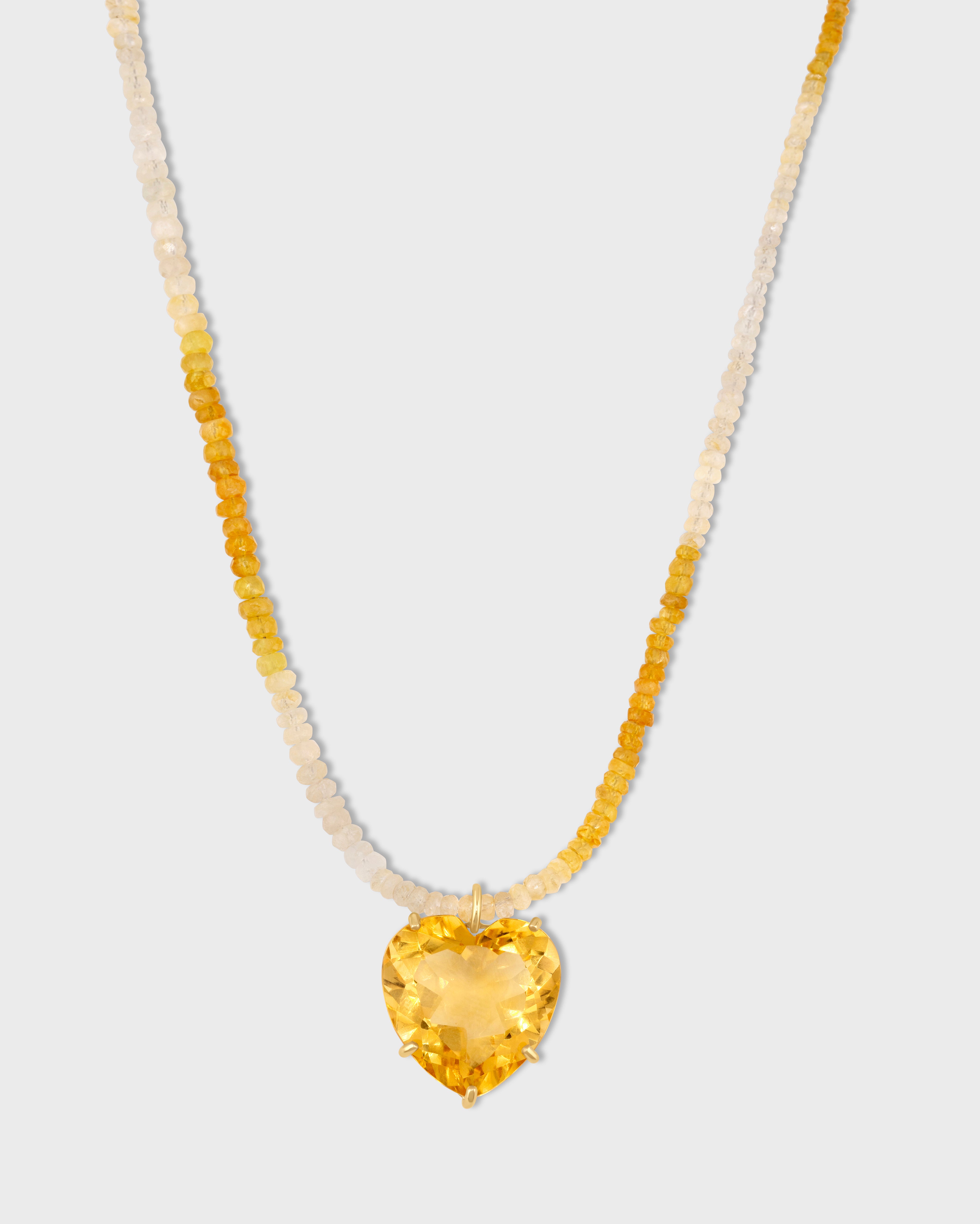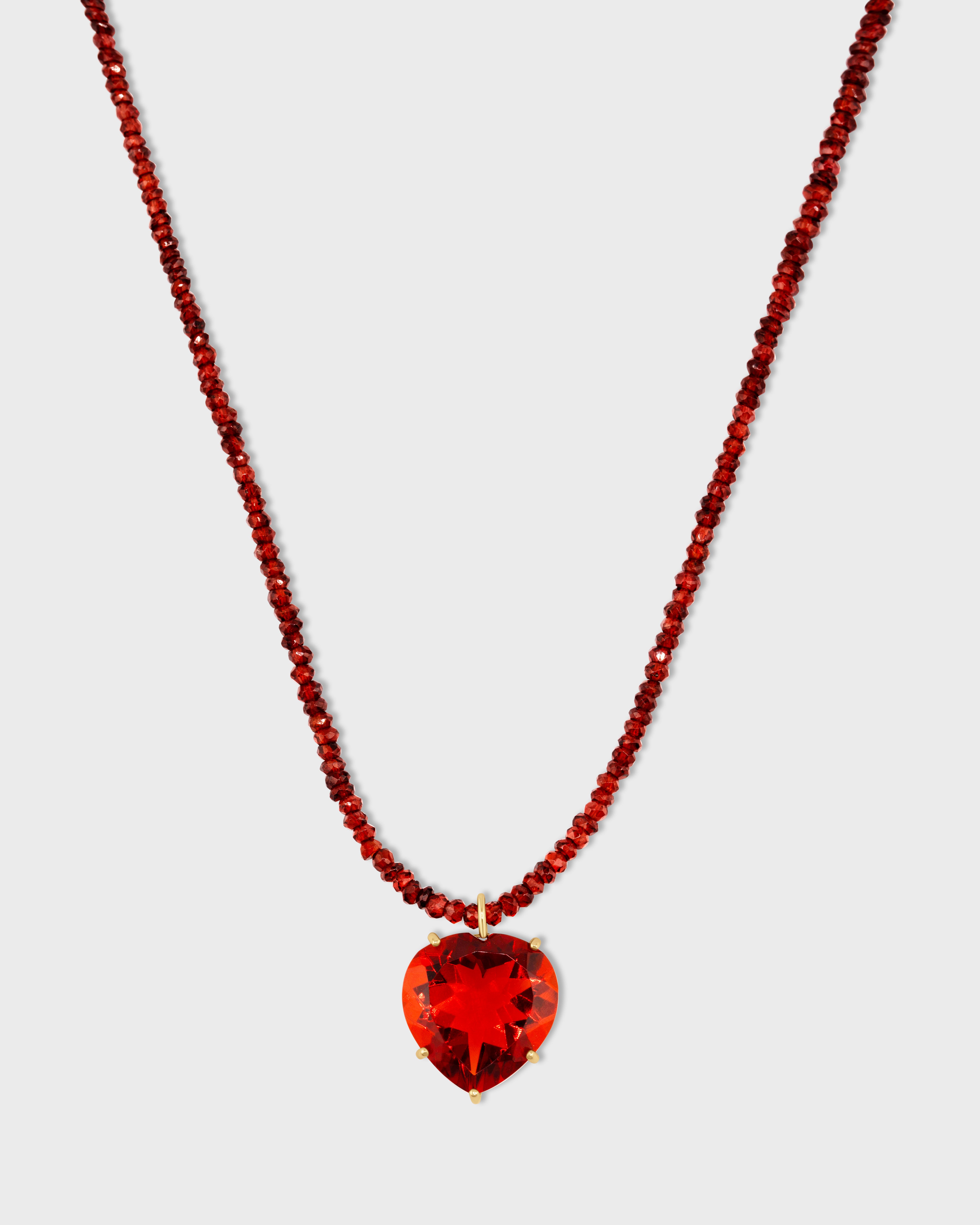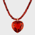 This piece features a stunning heart-shaped red garnet gemstone pendant paired with red garnet beads set in 14k Gold. Handcrafted in NYC.