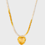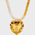 This piece features a stunning heart-shaped citrine gemstone pendant paired with yellow sapphire beads set in 14k Gold. Handcrafted in NYC.