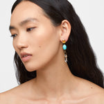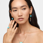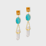 Turquoise is from a recent mine discovered in the United States called Mona Lisa Turquoise. It is a deep greenish blue color and banded with beige throughout. Here we have perfectly cut Mona Lisa cabochons and emerald cut citrine paired back to our signature crystal quartz gold bar pair of earrings.