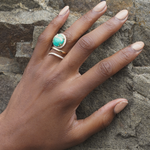Turquoise is from a recent mine discovered in the United States called Mona Lisa Turquoise. It is a deep greenish blue color and banded with beige throughout. It's a beautiful and rare find. Turquoise and golden spiral is surrounded by diamonds.