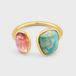 This piece features a striking combination of smooth turquoise and lustrous pink tourmaline. The open design showcases both stones side-by-side, creating a unique and eye-catching piece.