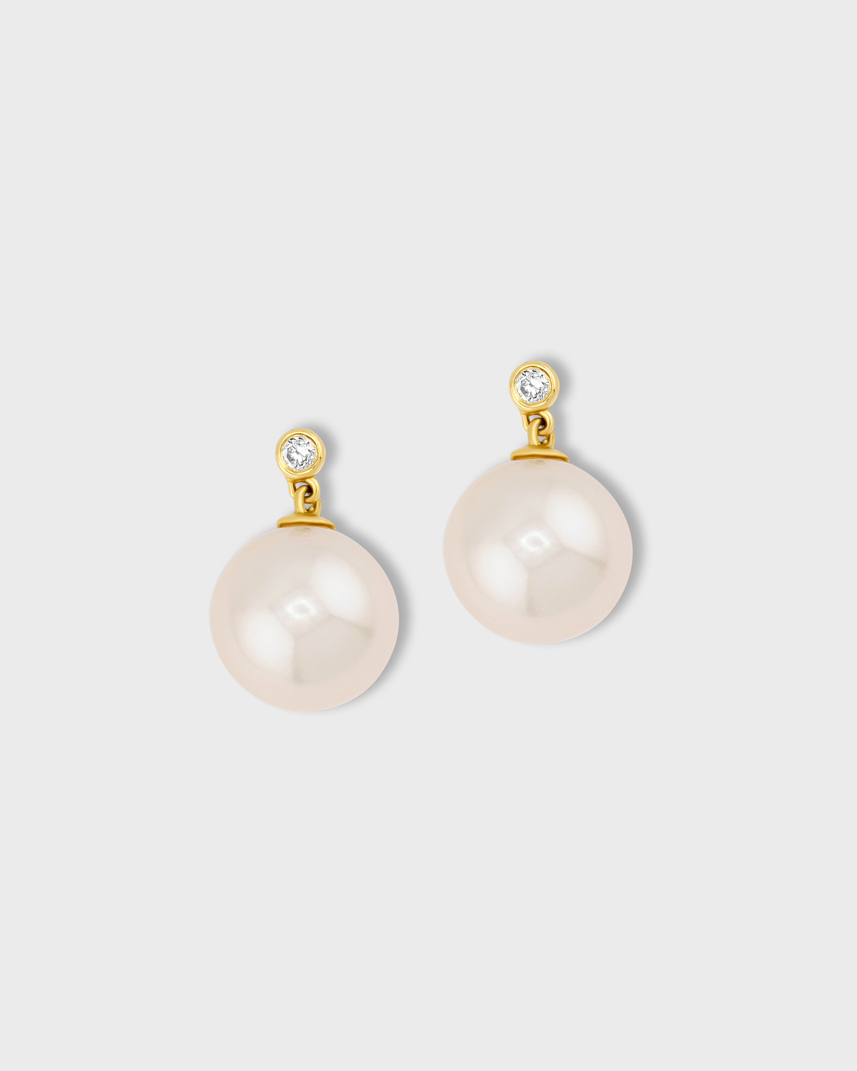 Elegant diamond bezel pearl earrings. Perfect for any occasion formal or casual.