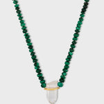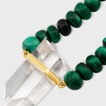 Beautiful malachite in rondelle cuts adorned in the center with our signature crystal quartz with custom hand set gold bar.