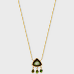 One of a kind green tourmaline slice with three gold bezel drops. It's beautiful and delicate and moves throughout. Green Tourmaline is an energy mover and shaker. Known for its life-giving vibes, it's ever ready to bring healing straight to the center of your heart and send it rippling out across the body. It’s an incredible stone for bringing virility, strength, and stamina both physically and emotionally.