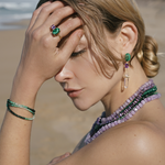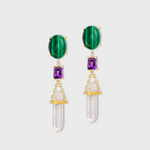 A combination of malachite, amethyst, and crystal quartz - a power trio. All custom hand made and hand set in 14 karat gold.