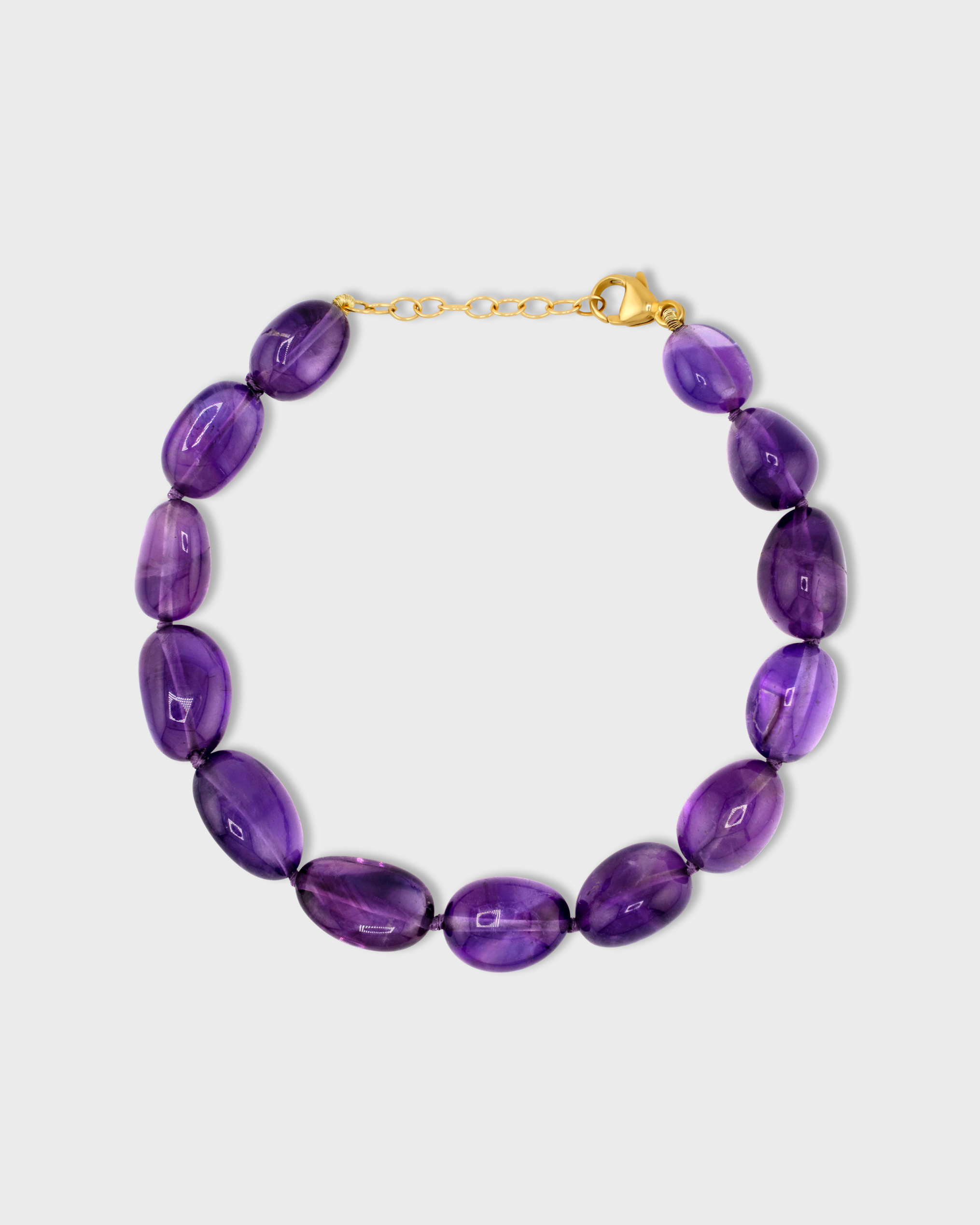 This captivating bracelet boasts a strand of large, oval-shaped Amethyst gemstones, each one showcasing the stone’s rich purple hue. The gemstones are strung together with 14k gold-filled wire, creating a luxurious and elegant piece.14 karat yellow gold
