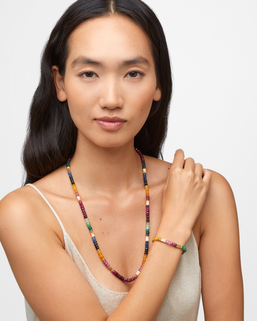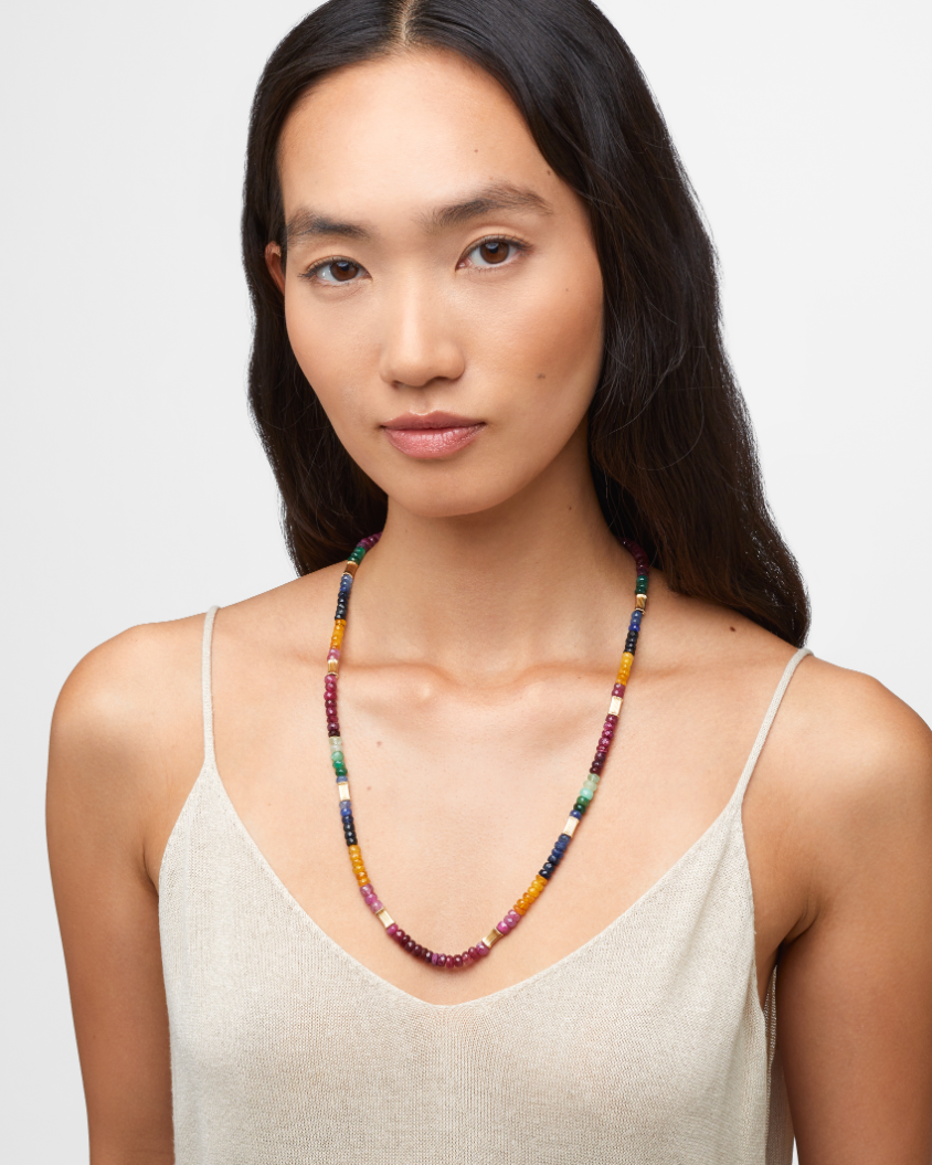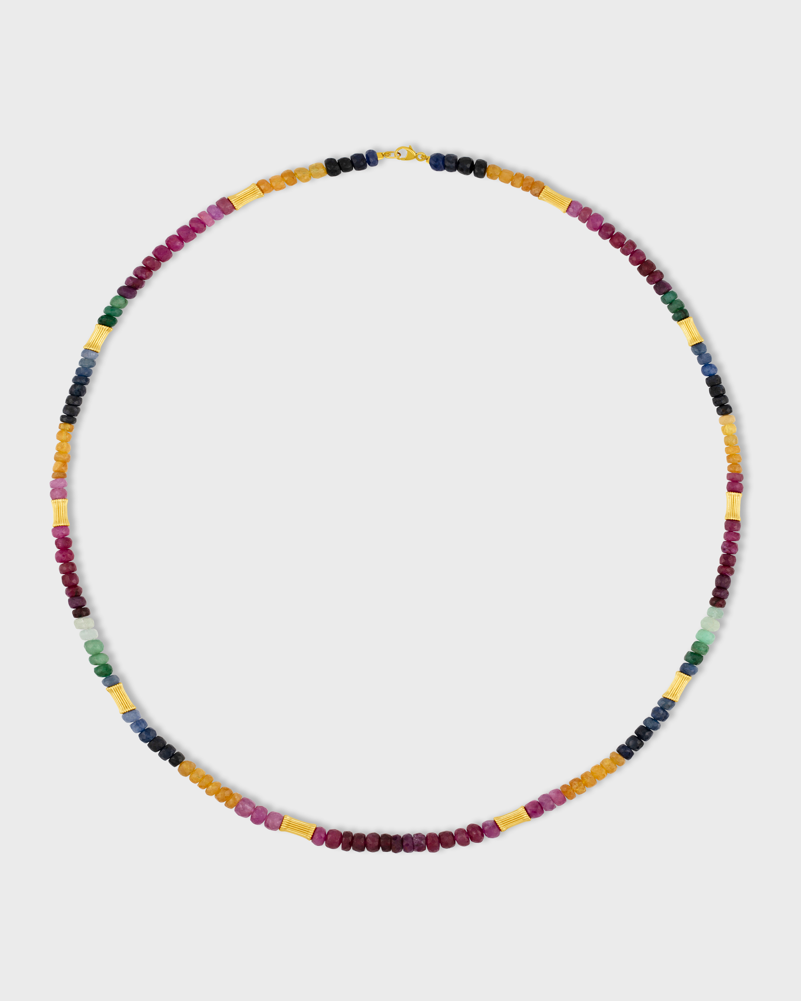 A colorful spectrum of sapphires combined with gold beads, this necklace exudes joy and vitality. Its diverse palette of hues makes it an eye-catching piece, perfect for expressing individuality and charm.