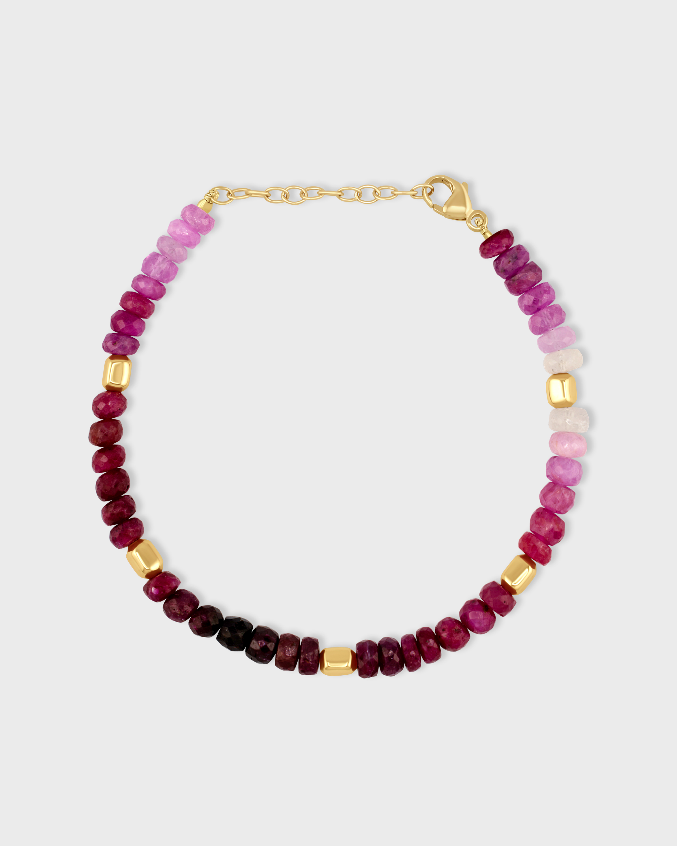 A gradient of rich ruby hues transitions beautifully from deep crimson to light pink, accented with polished gold beads. This bracelet captures the essence of passion and luxury.