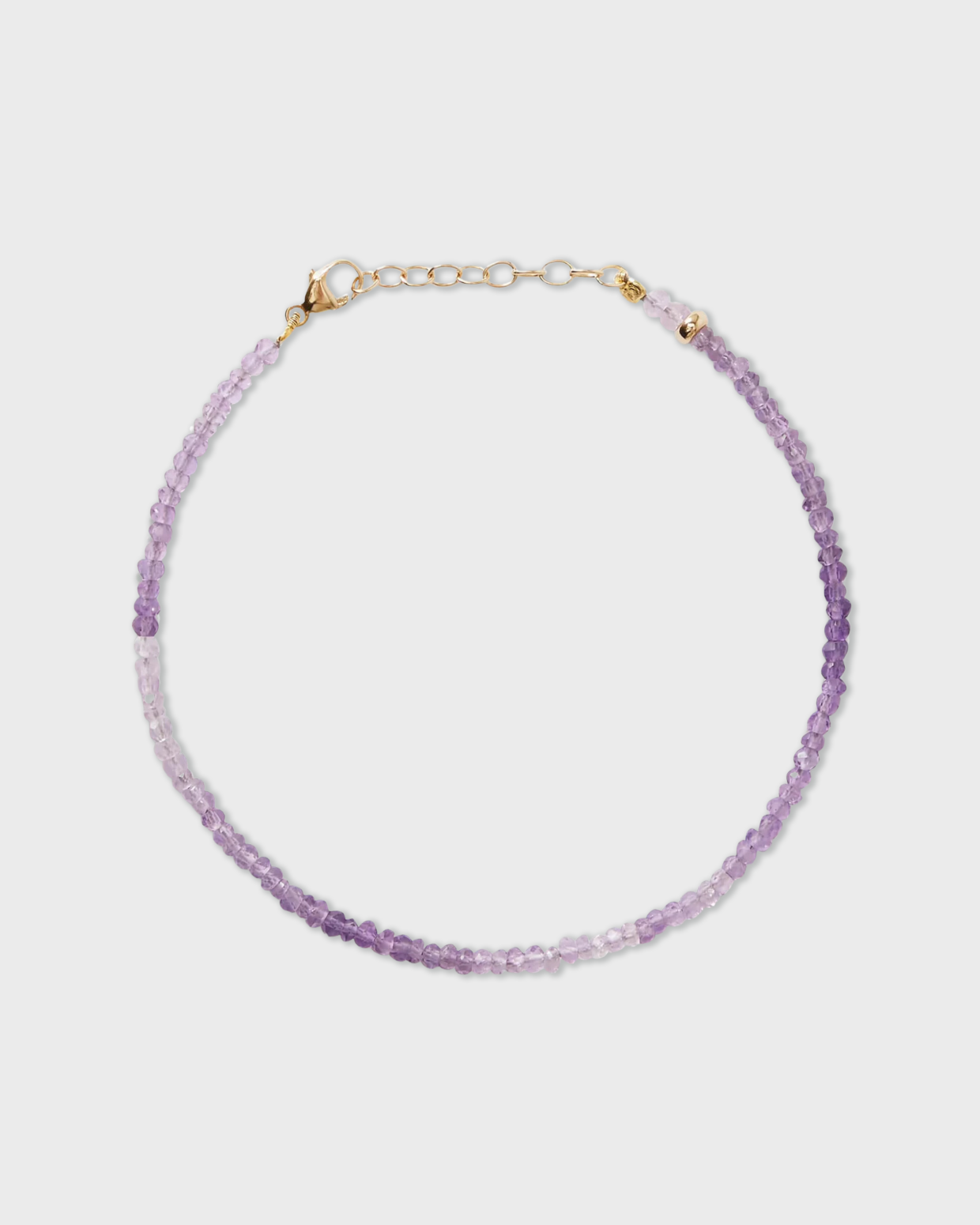 Natural amethyst crystal beads hand strung in New York City and finished with 14 karat yellow gold.