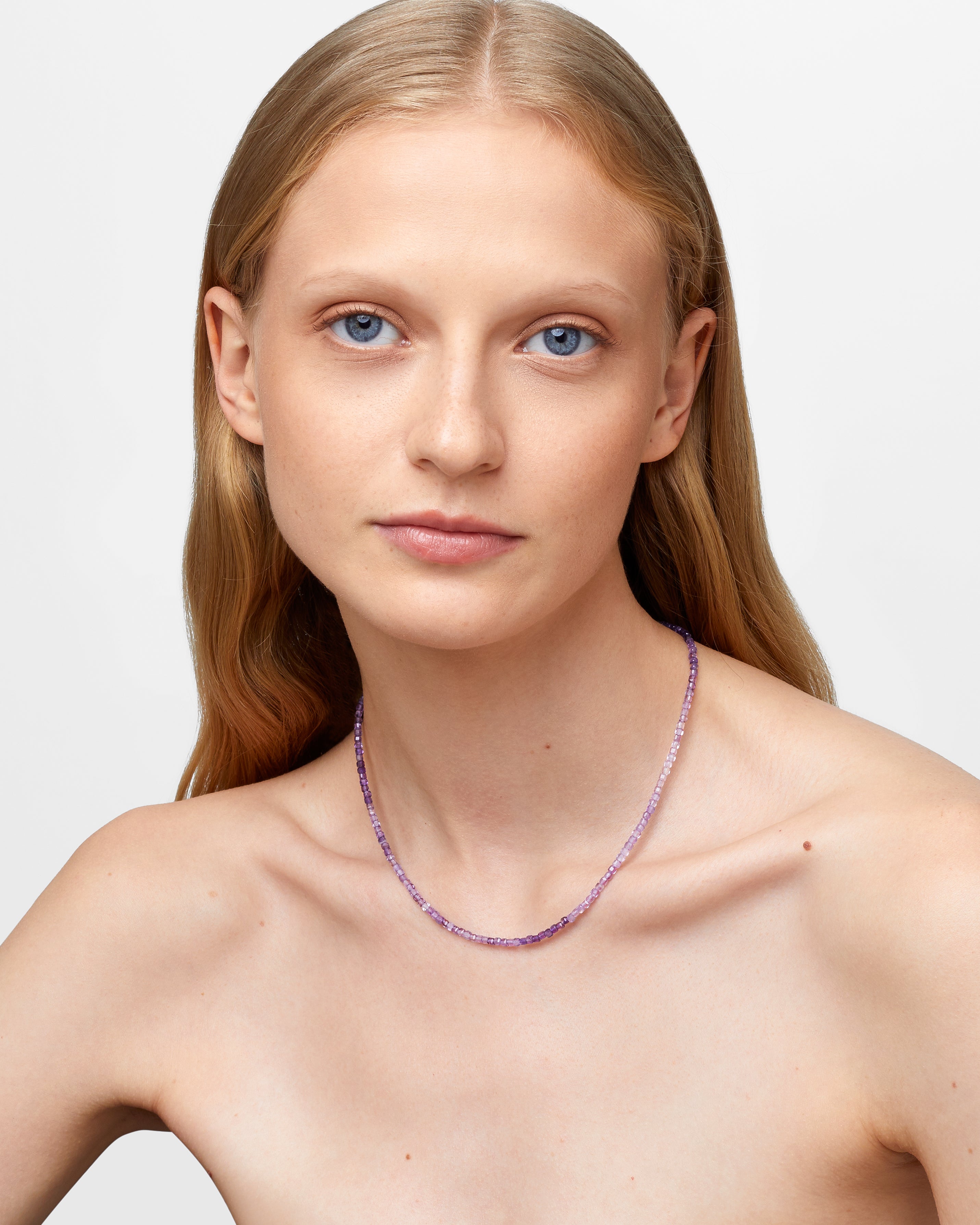 Natural amethyst crystal beads hand strung in New York City and finished with 14 karat yellow gold.