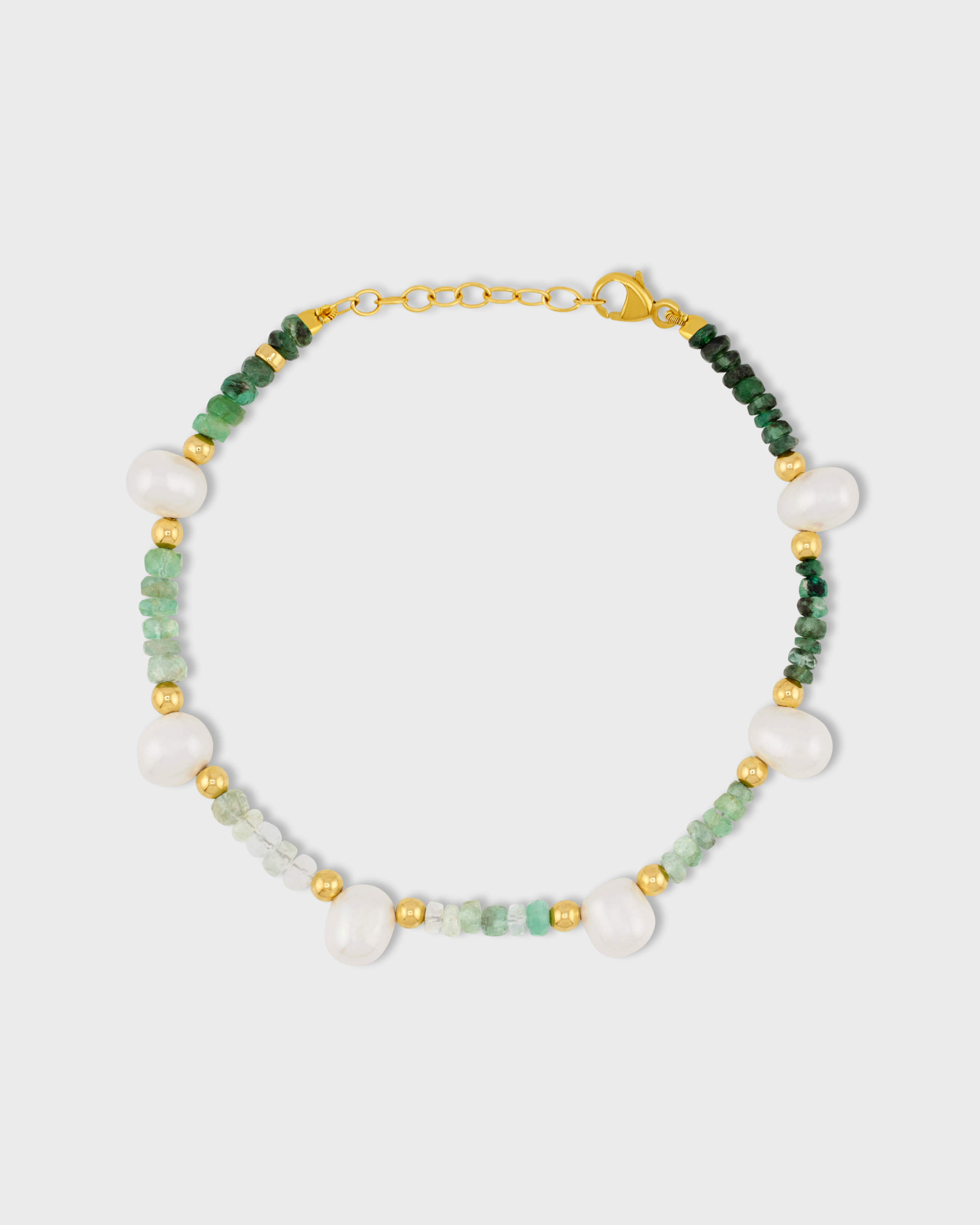 This elegant bracelet features a gradient of green emeralds, ranging from deep green to light green. The gemstones are interspersed with lustrous pearls and gold-filled beads, creating a luxurious and sophisticated piece.