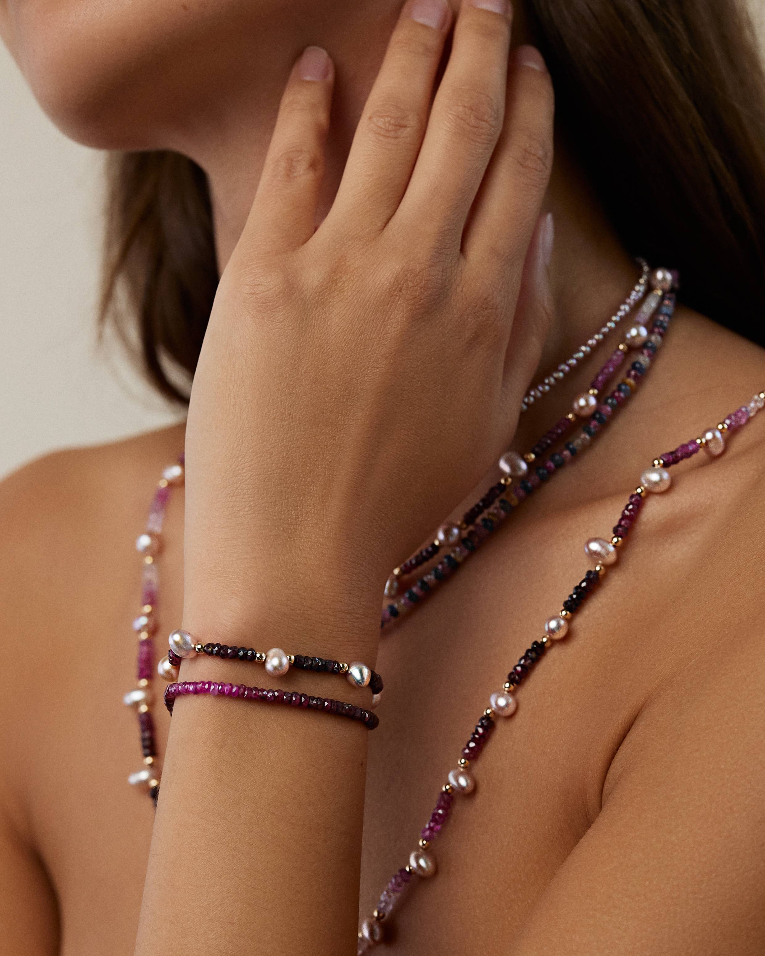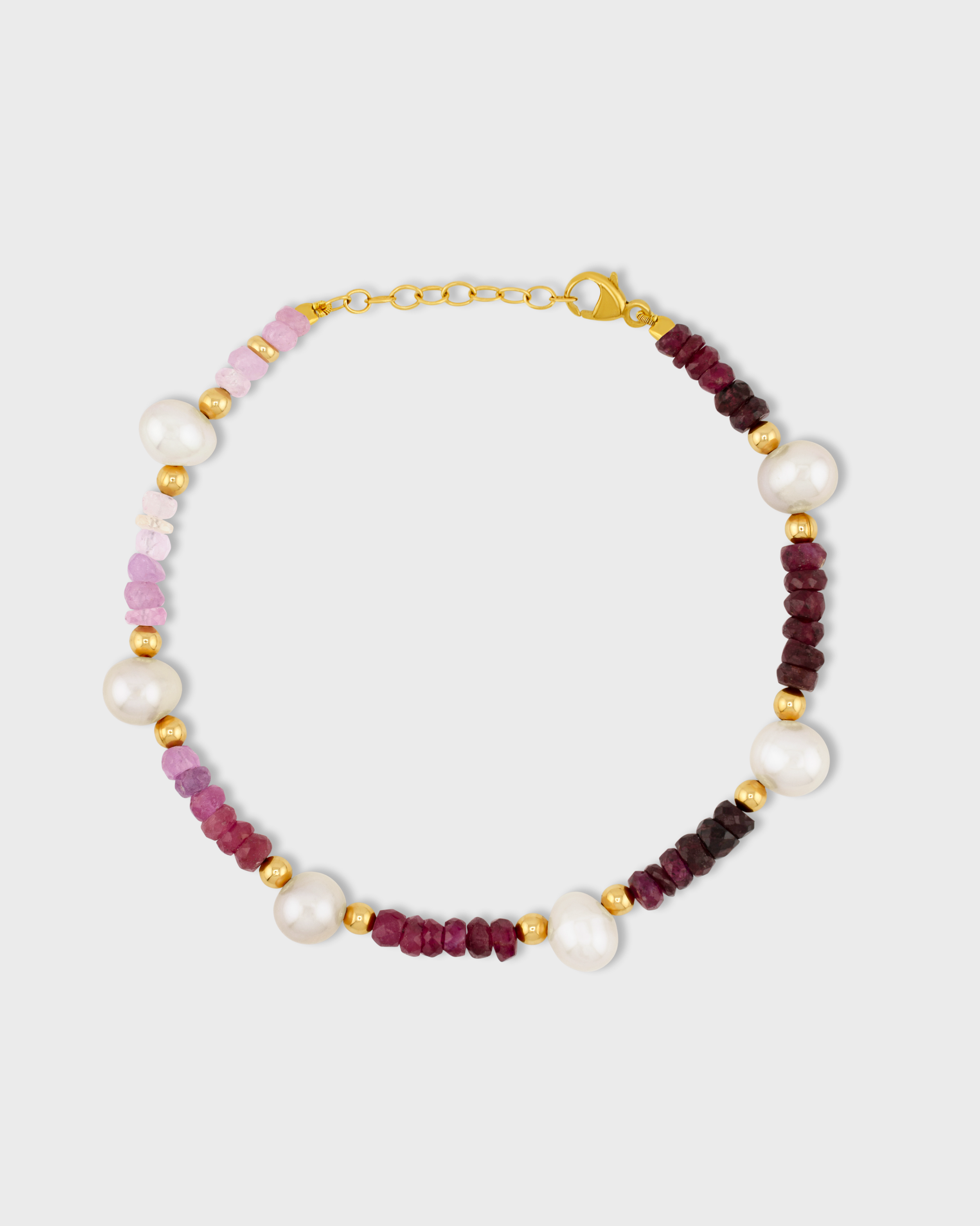 Hand strung ruby pearl bracelet finished in 14 karat gold.
