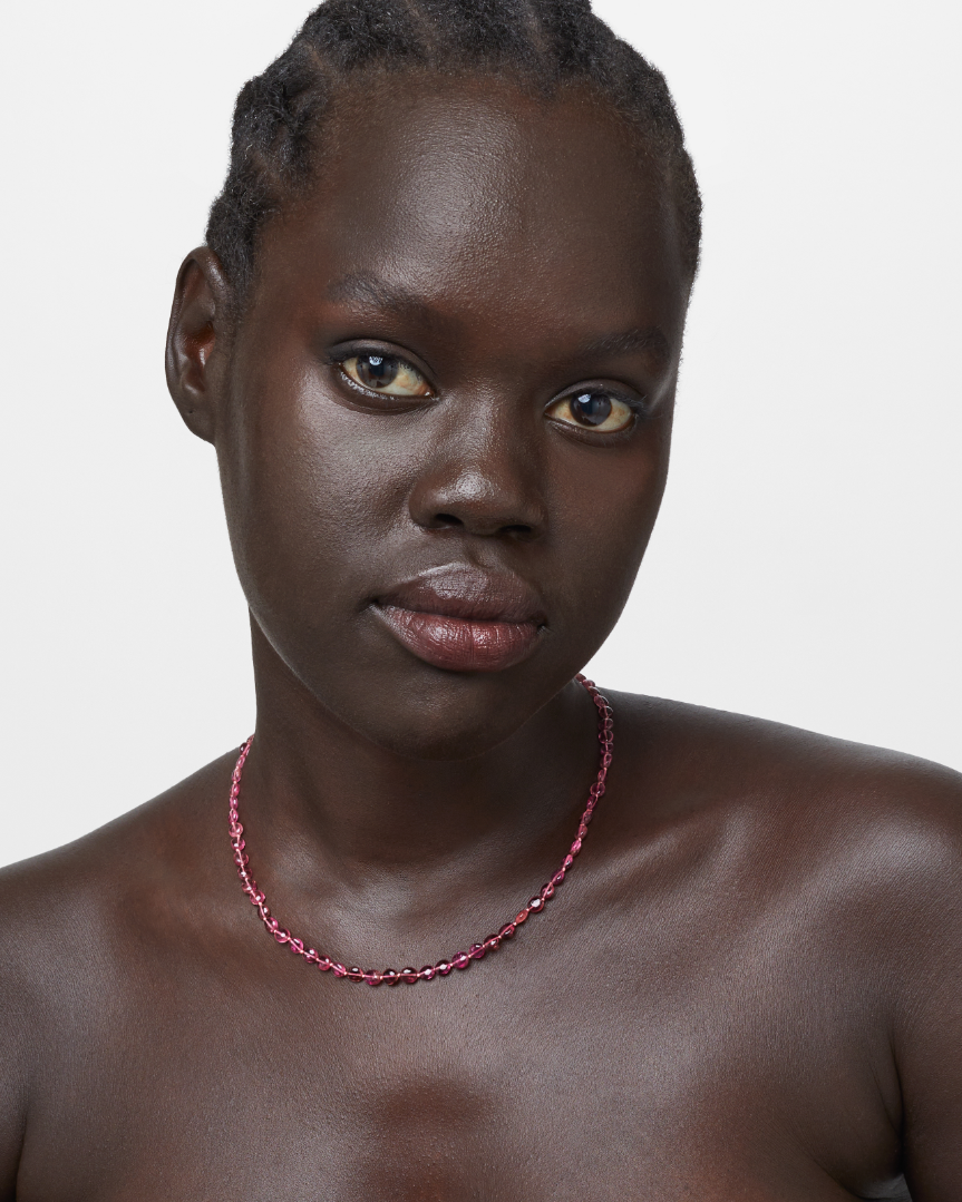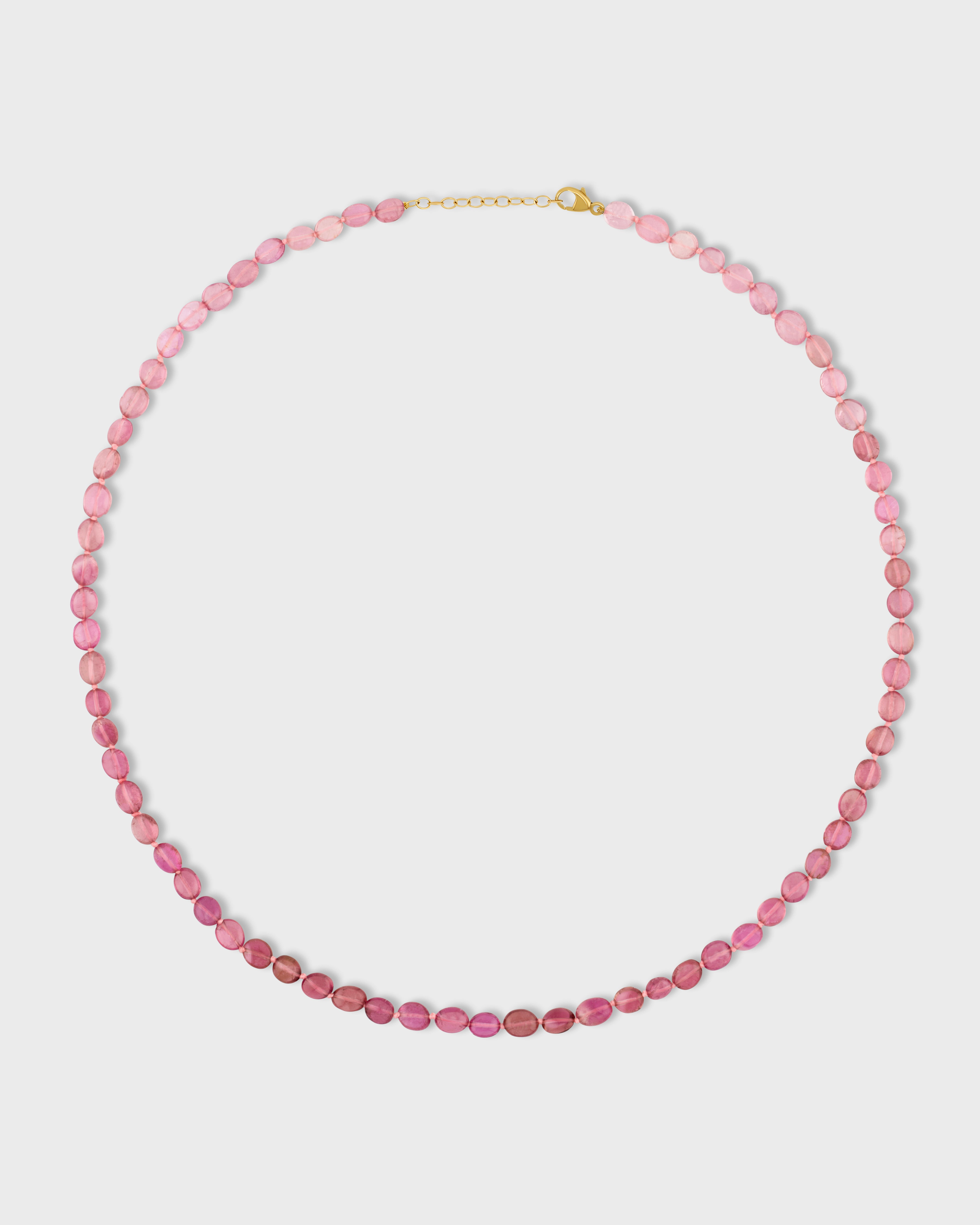 Featuring soft pink tourmaline stones, this necklace adds a touch of femininity and grace to any outfit. The smooth, oval beads create a fluid, understated design, perfect for layering or wearing on its own for a delicate touch of color.
