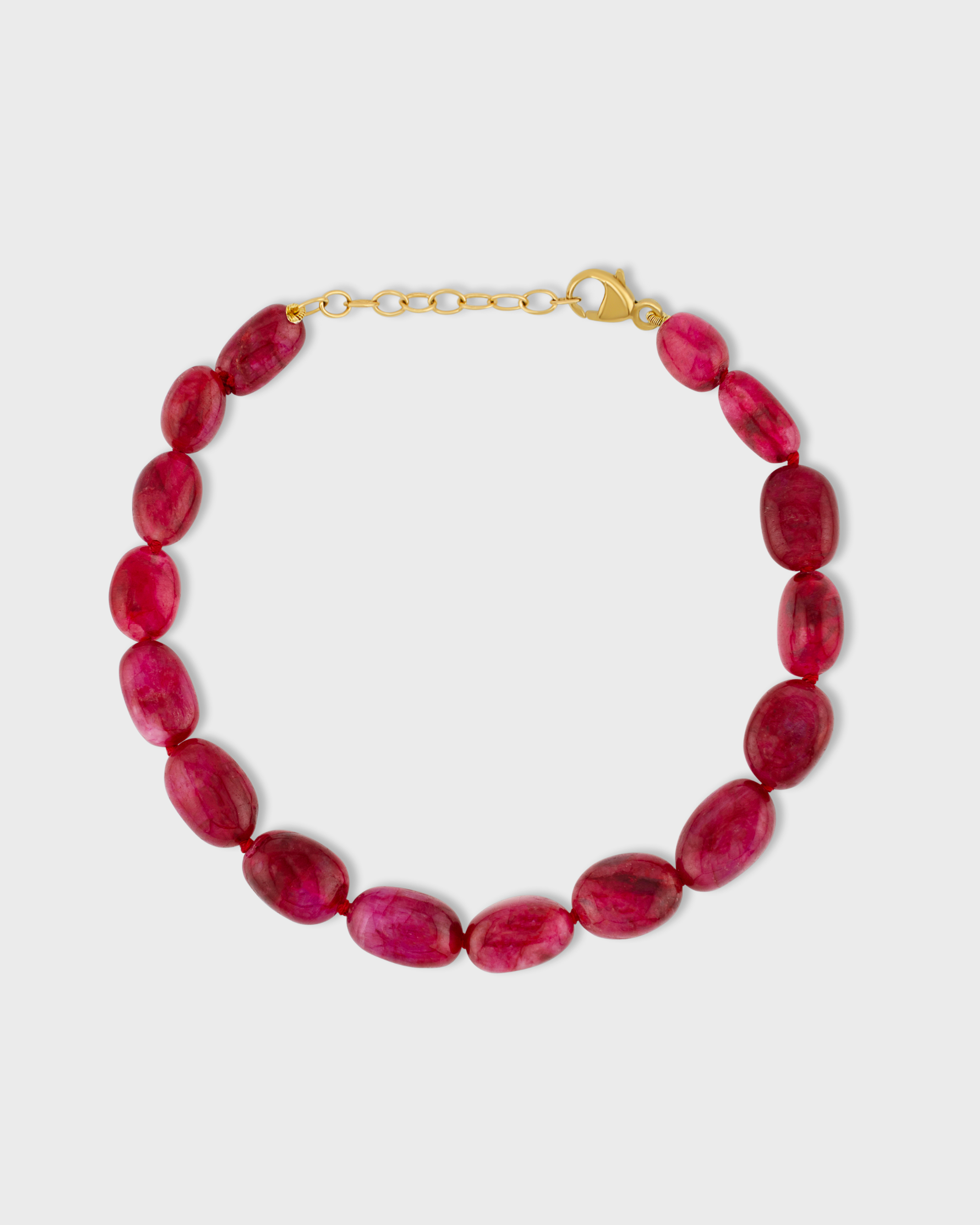 This vivid ruby quartz bracelet features smooth, oval-shaped stones showcasing their rich crimson hue. Perfect for adding a touch of elegance and boldness to any outfit.