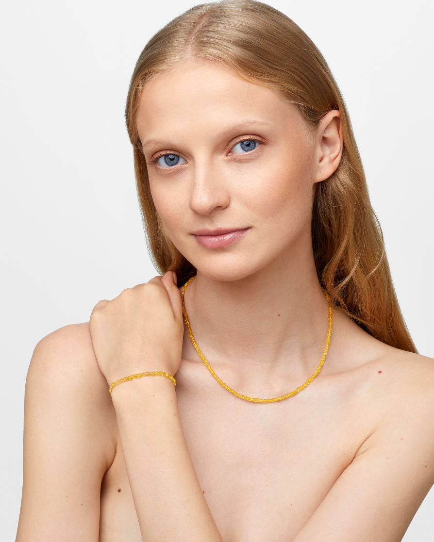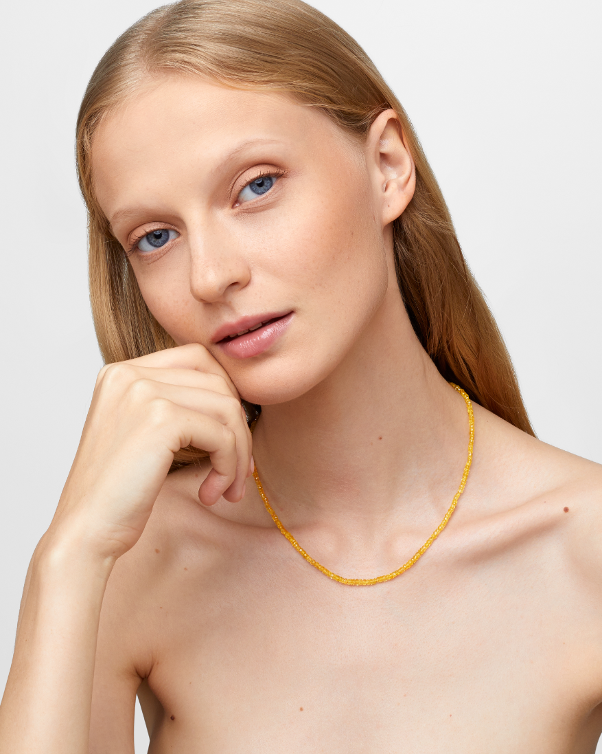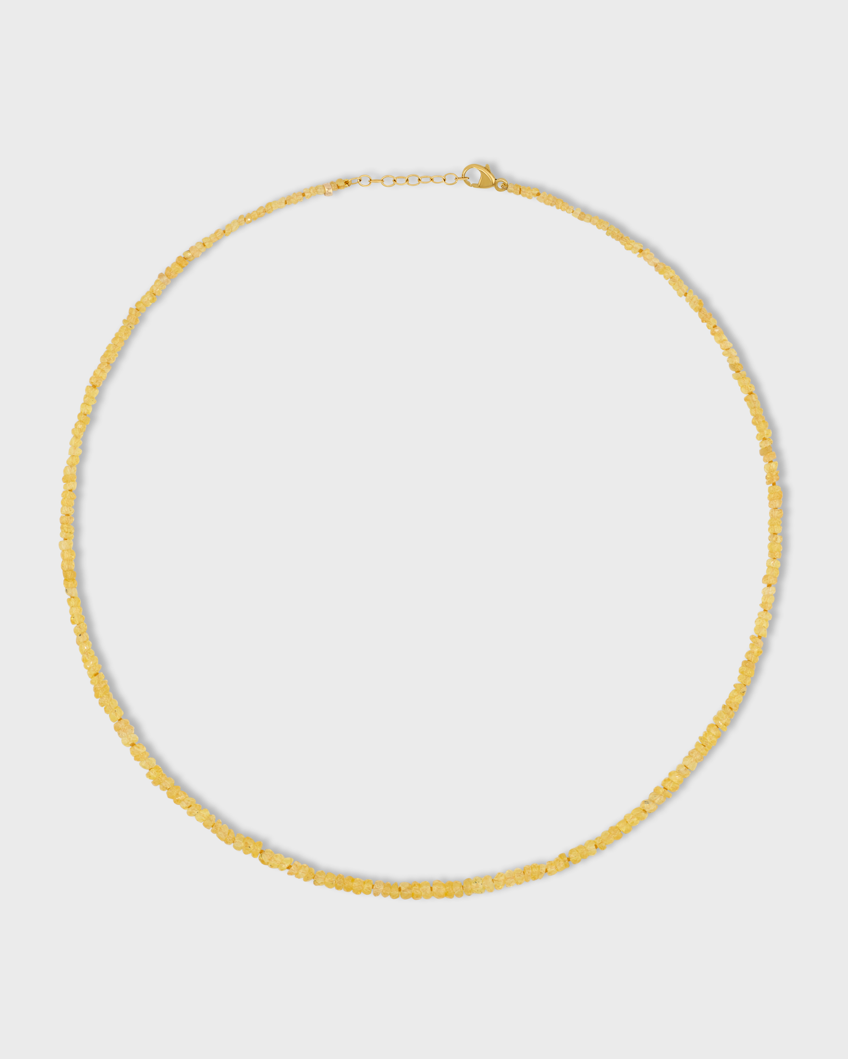 Lemon yellow sapphire necklace with to attract prosperity and good luck. Hand strung and finished with 14 karat gold in NYC.