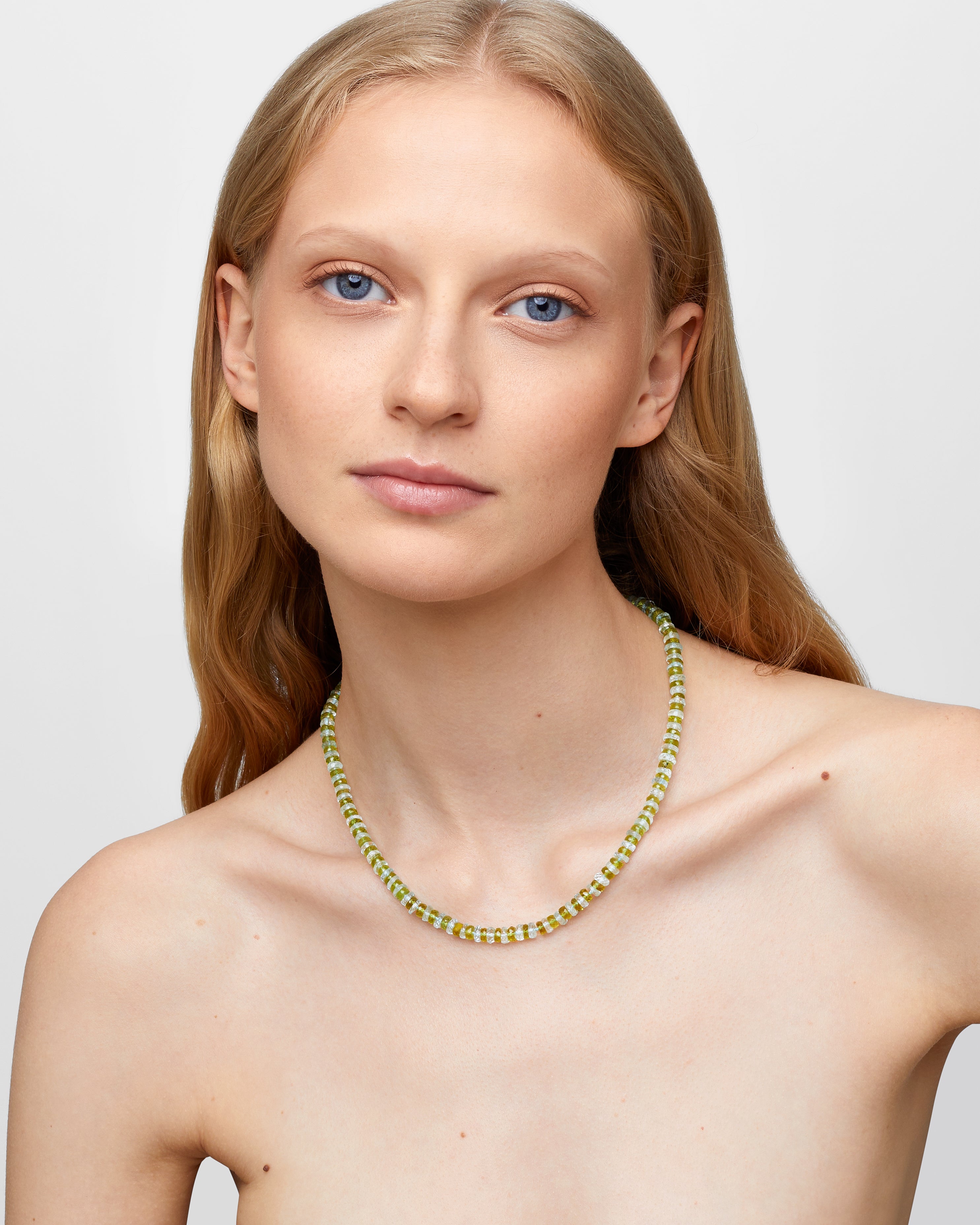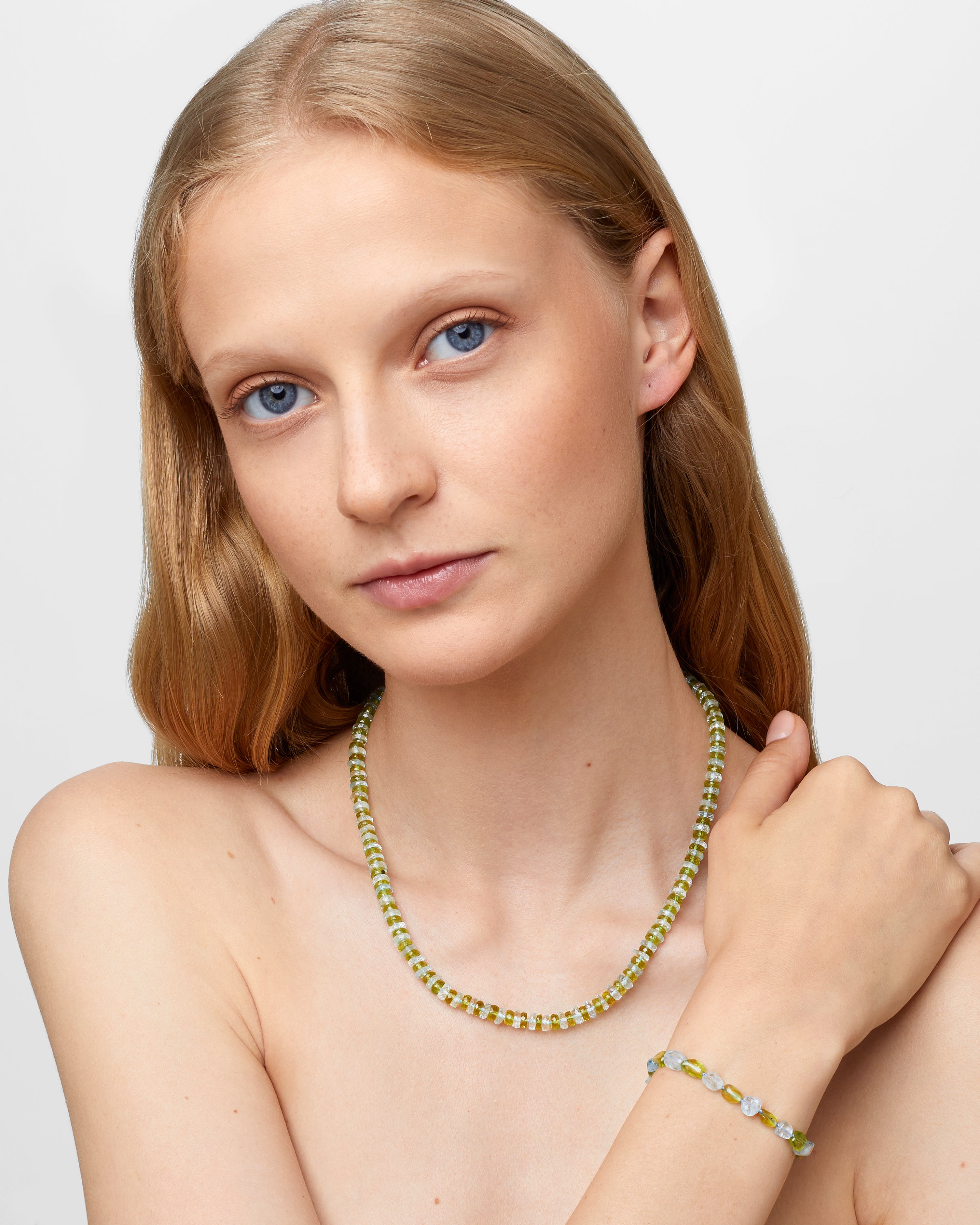Fancy cut aquamarine and peridot hand strung in the heart of New York City and finished with 14 karat yellow gold.