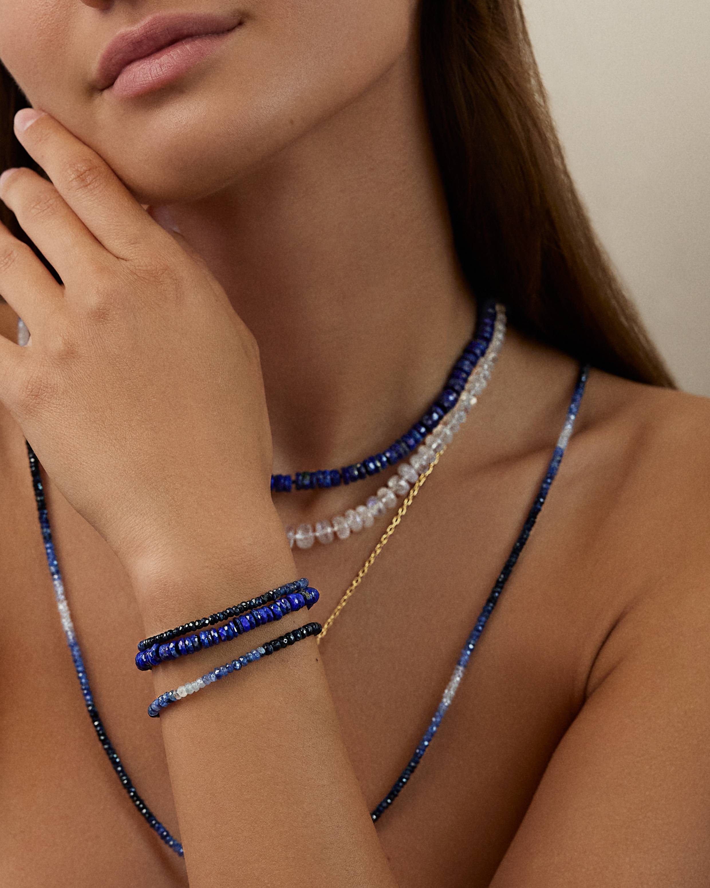 A rich blue of Lapis Lazuli hand cut into faceted crystals hand strung with silk in New York City. What makes this piece special is its faceted cut nature which gives it a natural sparkle. This bracelet is finished in 14 karat gold hardware and chain.