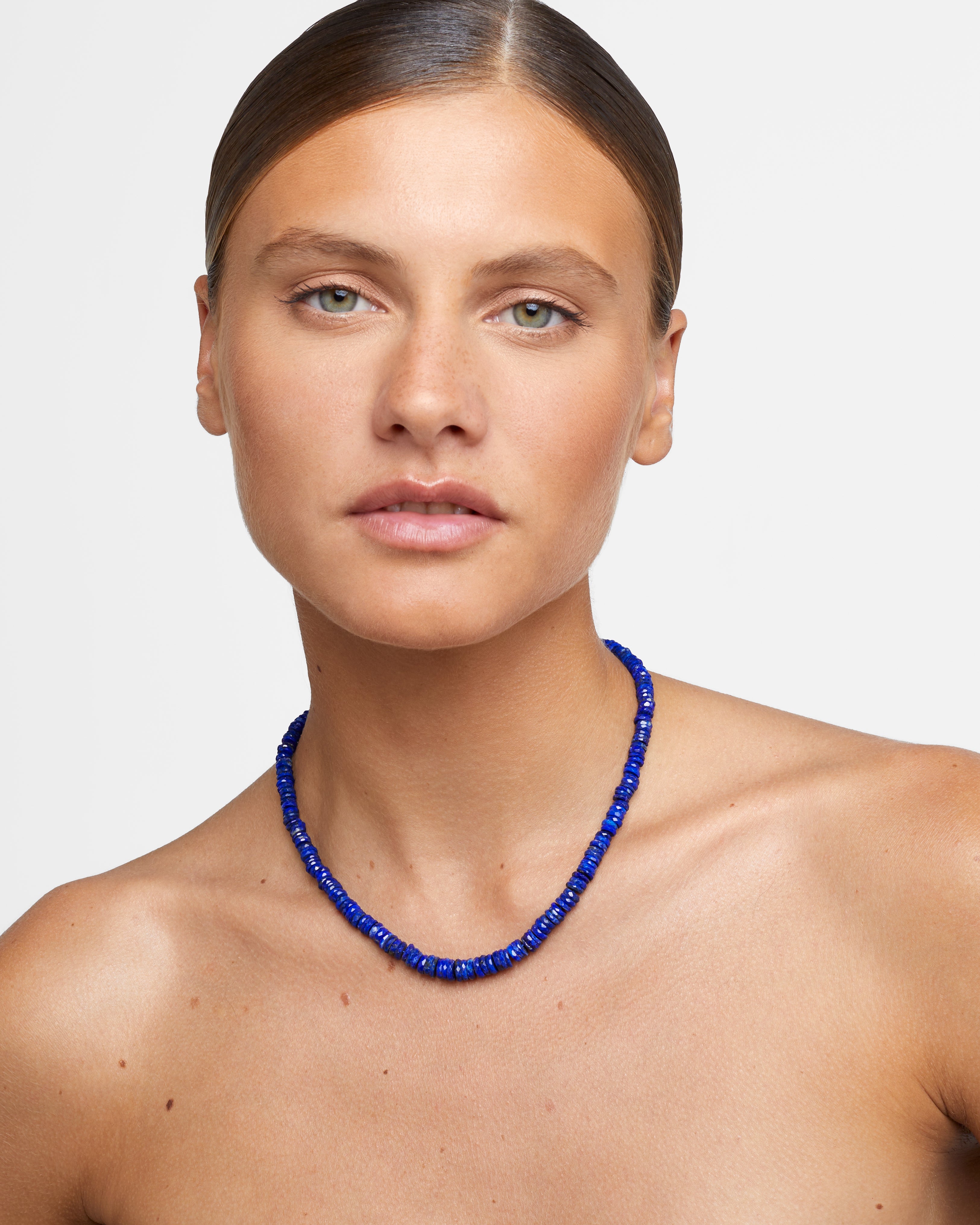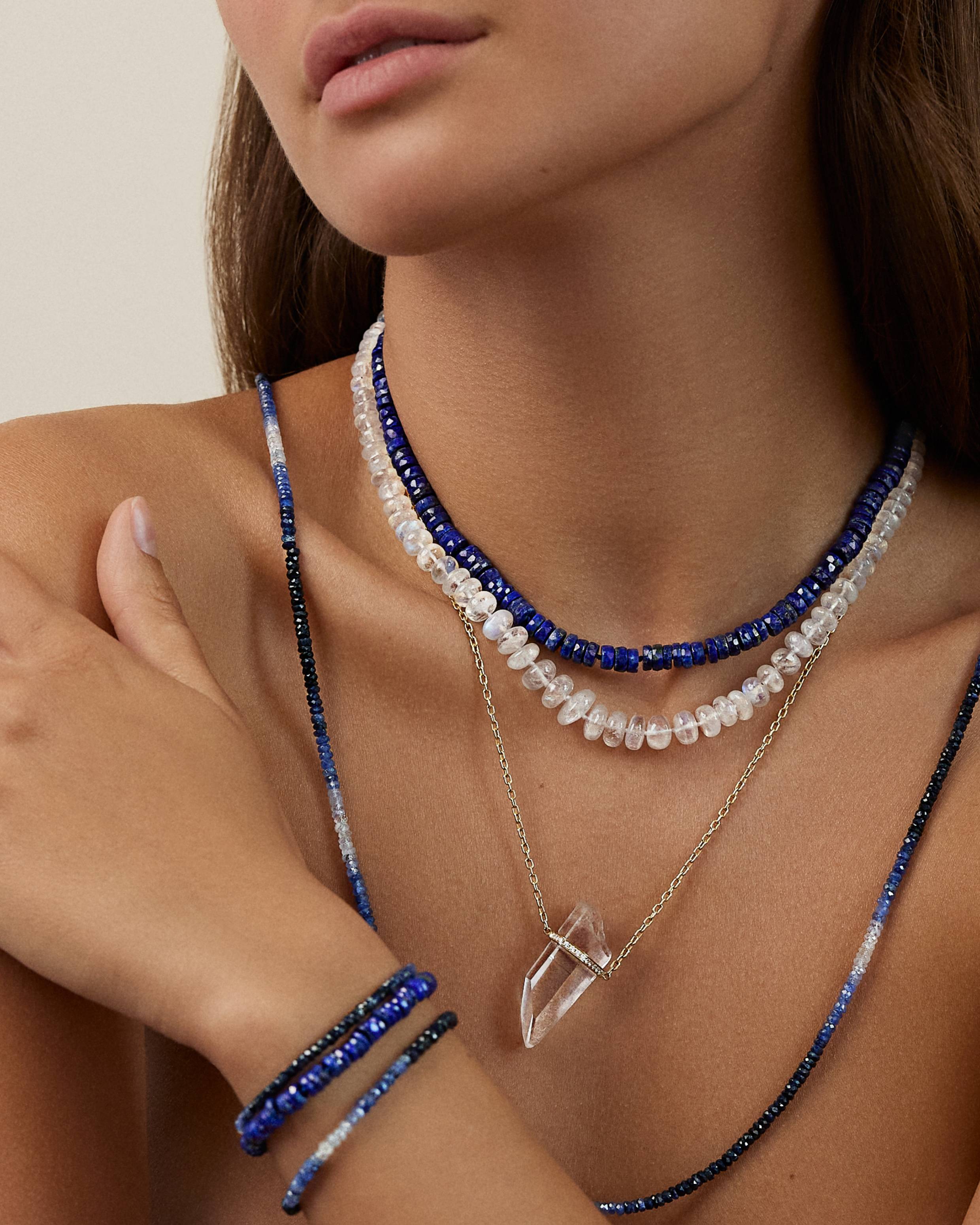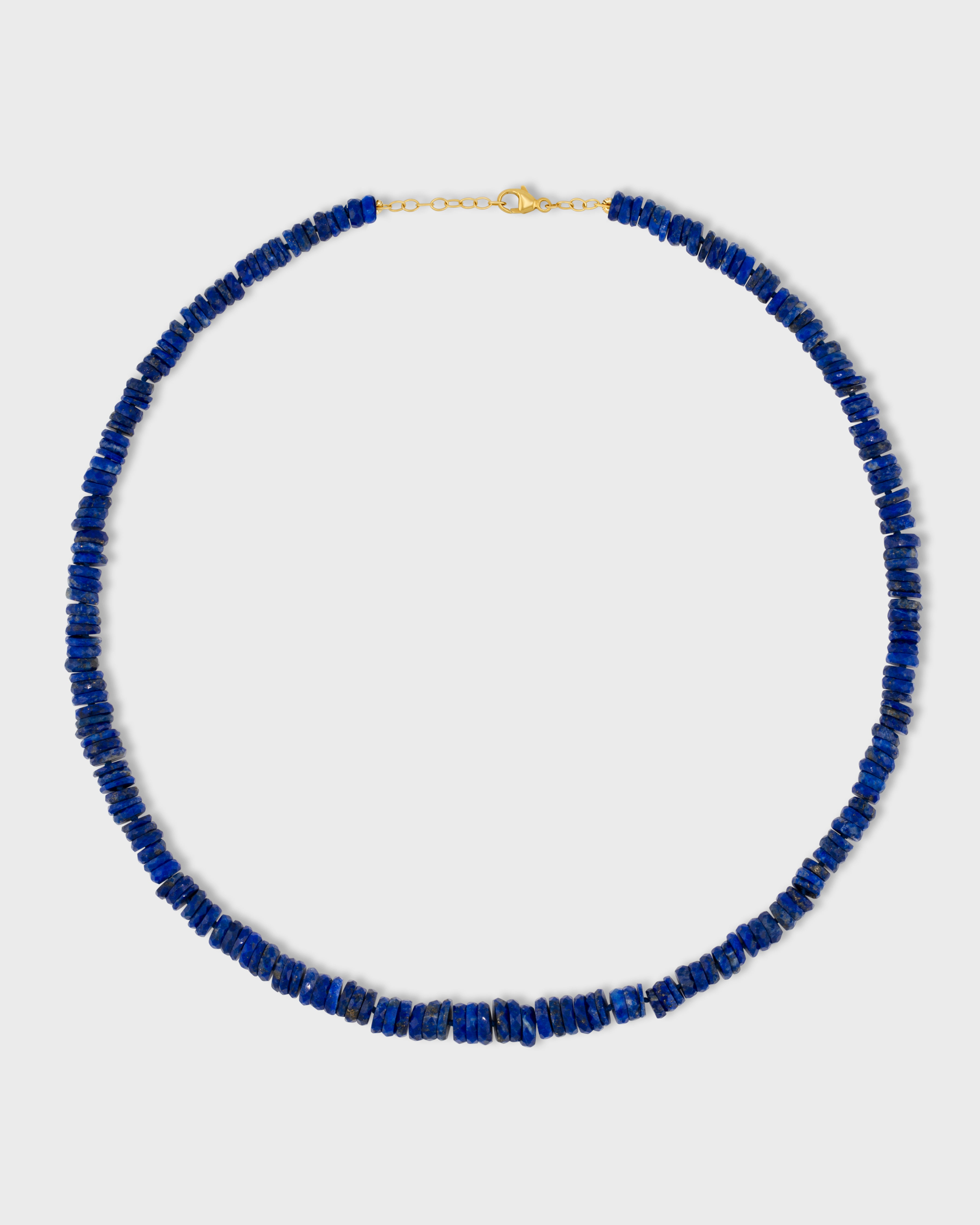 A rich blue of Lapis Lazuli hand cut into faceted crystals hand strung with silk in New York City. What makes this piece special is its faceted cut nature which gives it a natural sparkle. This necklace is finished in 14 karat gold hardware and chain.