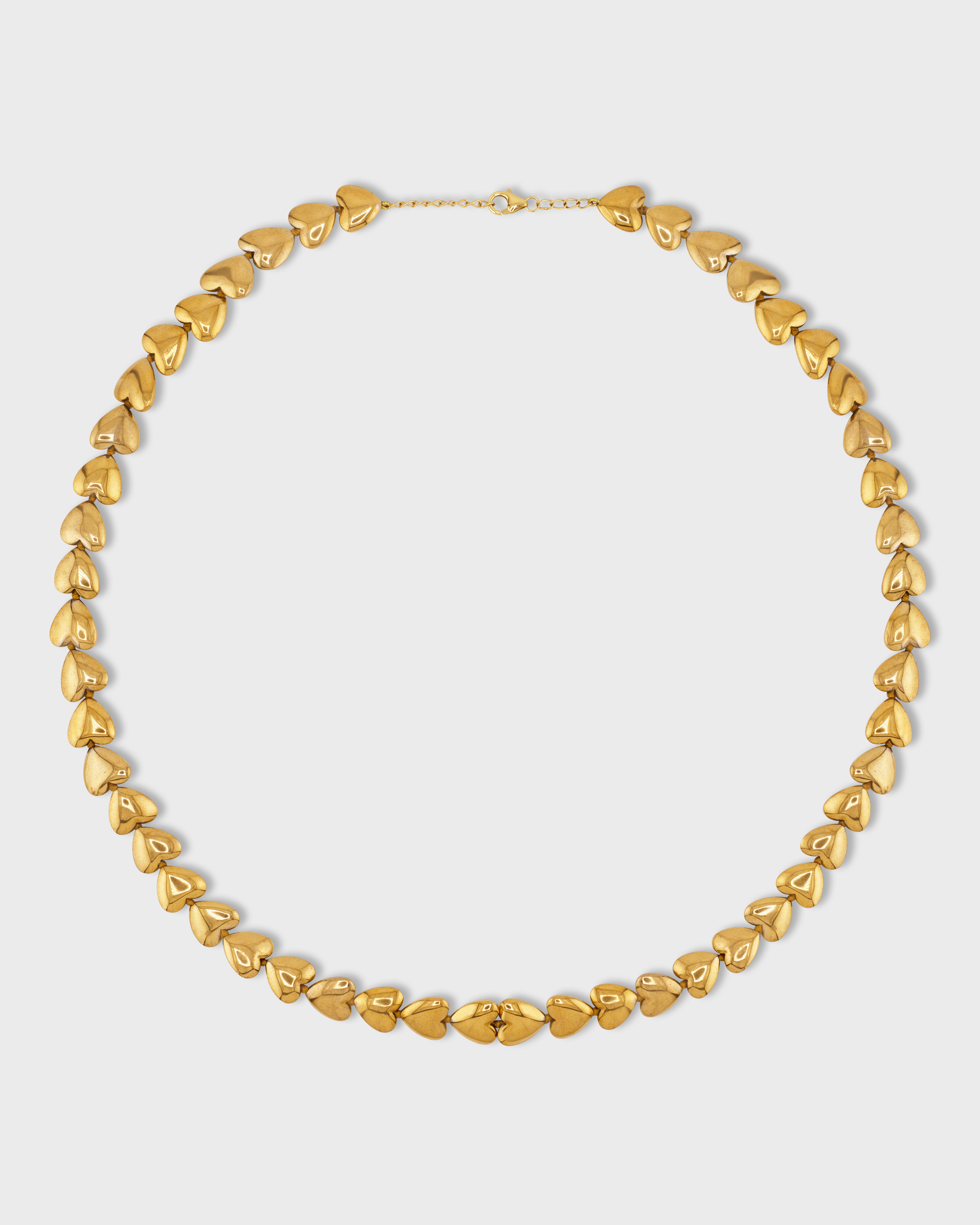 The Hematite Golden Heart Necklace showcases a striking design with polished golden heart-shaped beads, creating a bold yet elegant statement piece that embodies love and beauty. Perfect for adding a touch of luxury to any outfit.