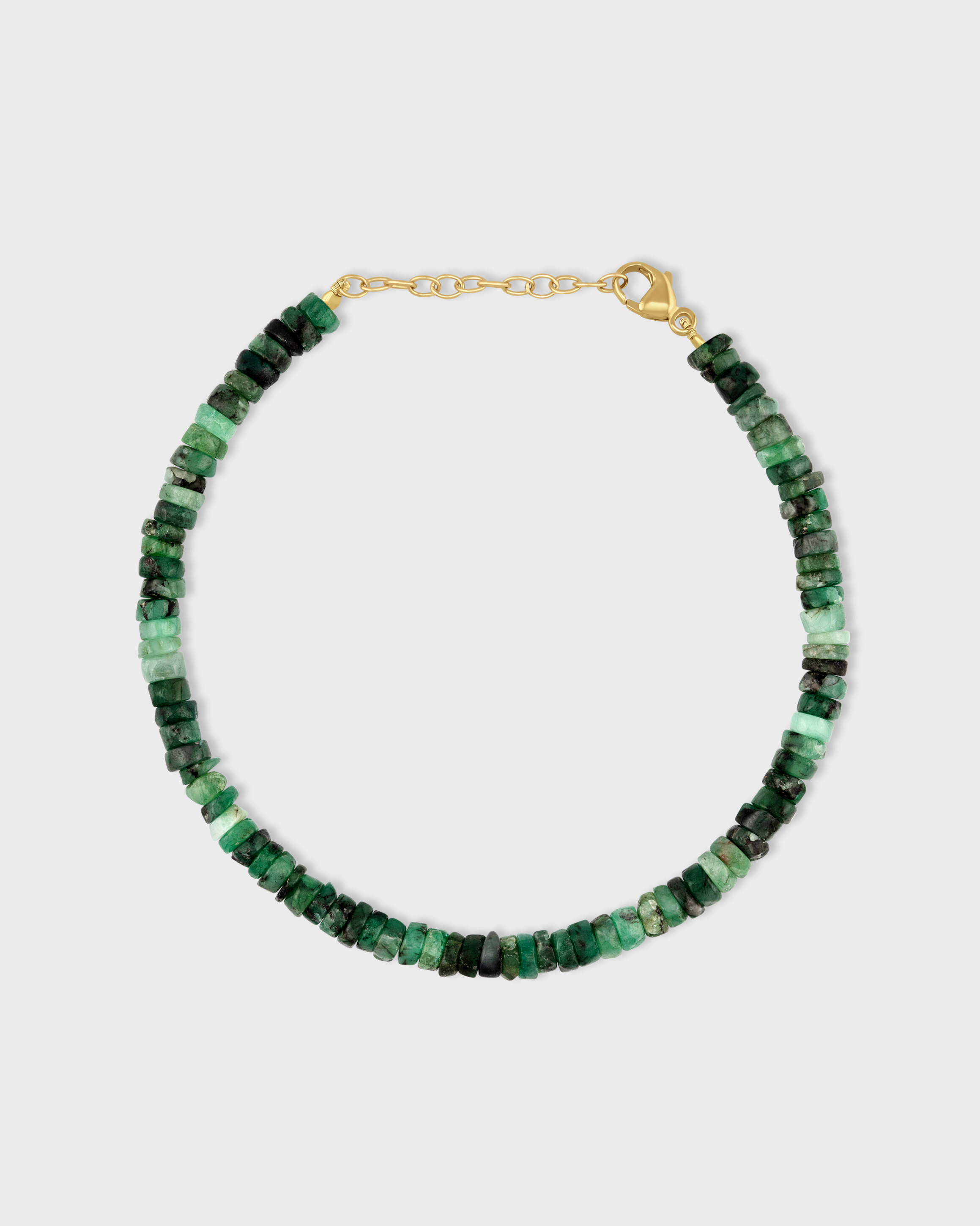 Beautiful faceted cut emerald gemstone bracelet that is hand knotted and finished in 14 karat gold.