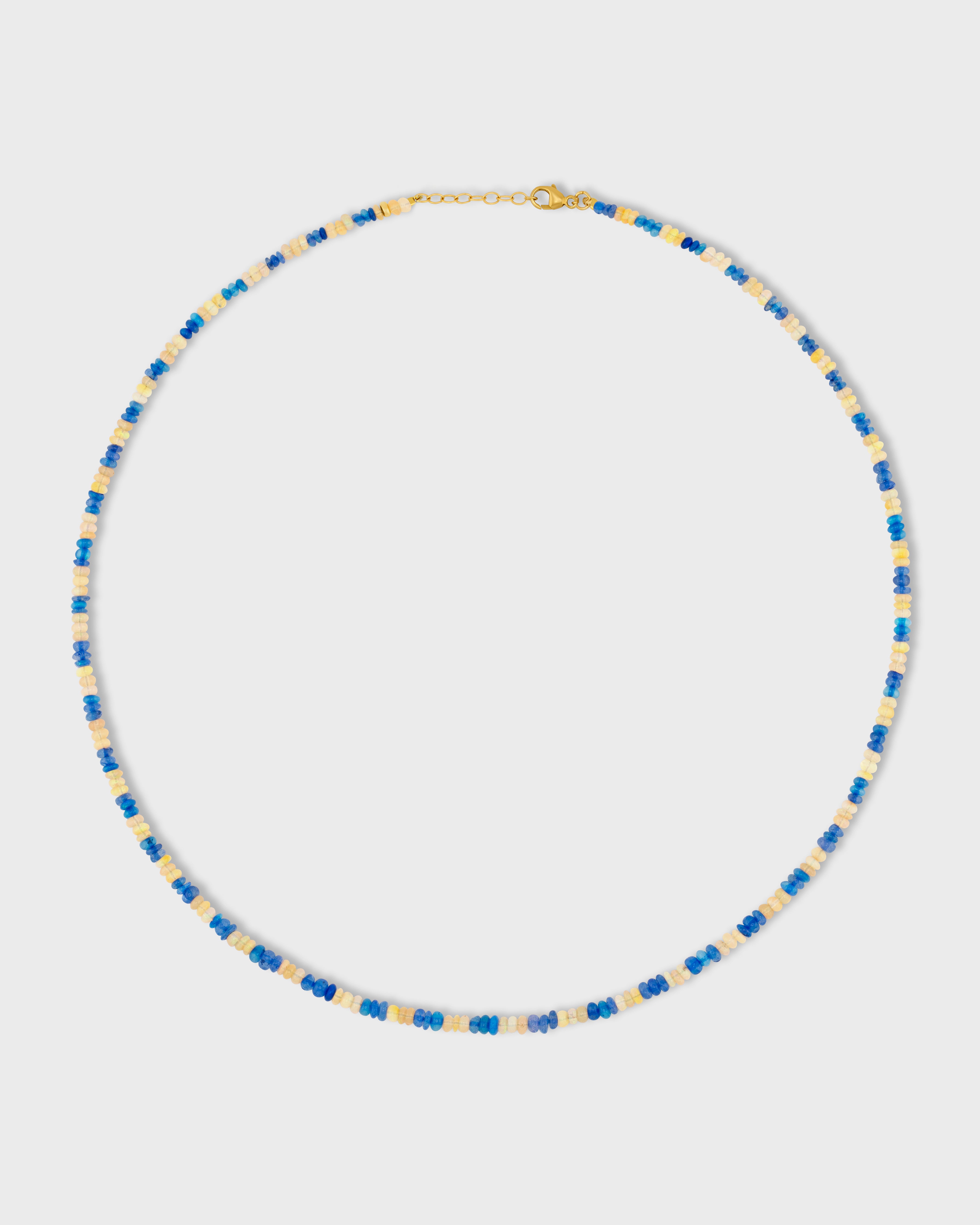 Bright blue and yellow opals hand strung in New York City and finished with 14 karat yellow gold.