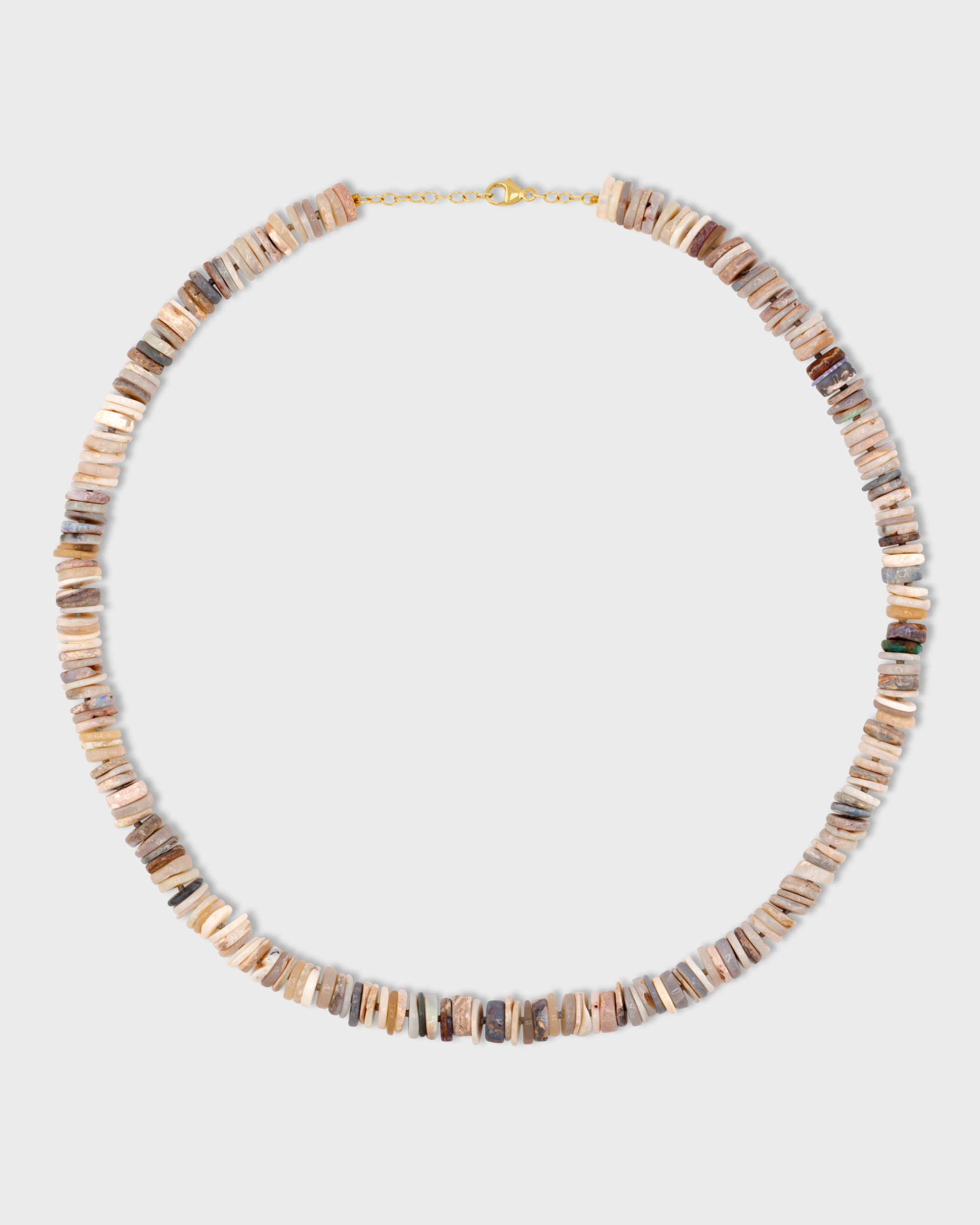 This Necklace features a series of flat, circular opal beads, typically strung closely together in a heishi-style formation. The colors range from creamy whites to various shades of brown and subtle grays, giving it an earthy and natural look.