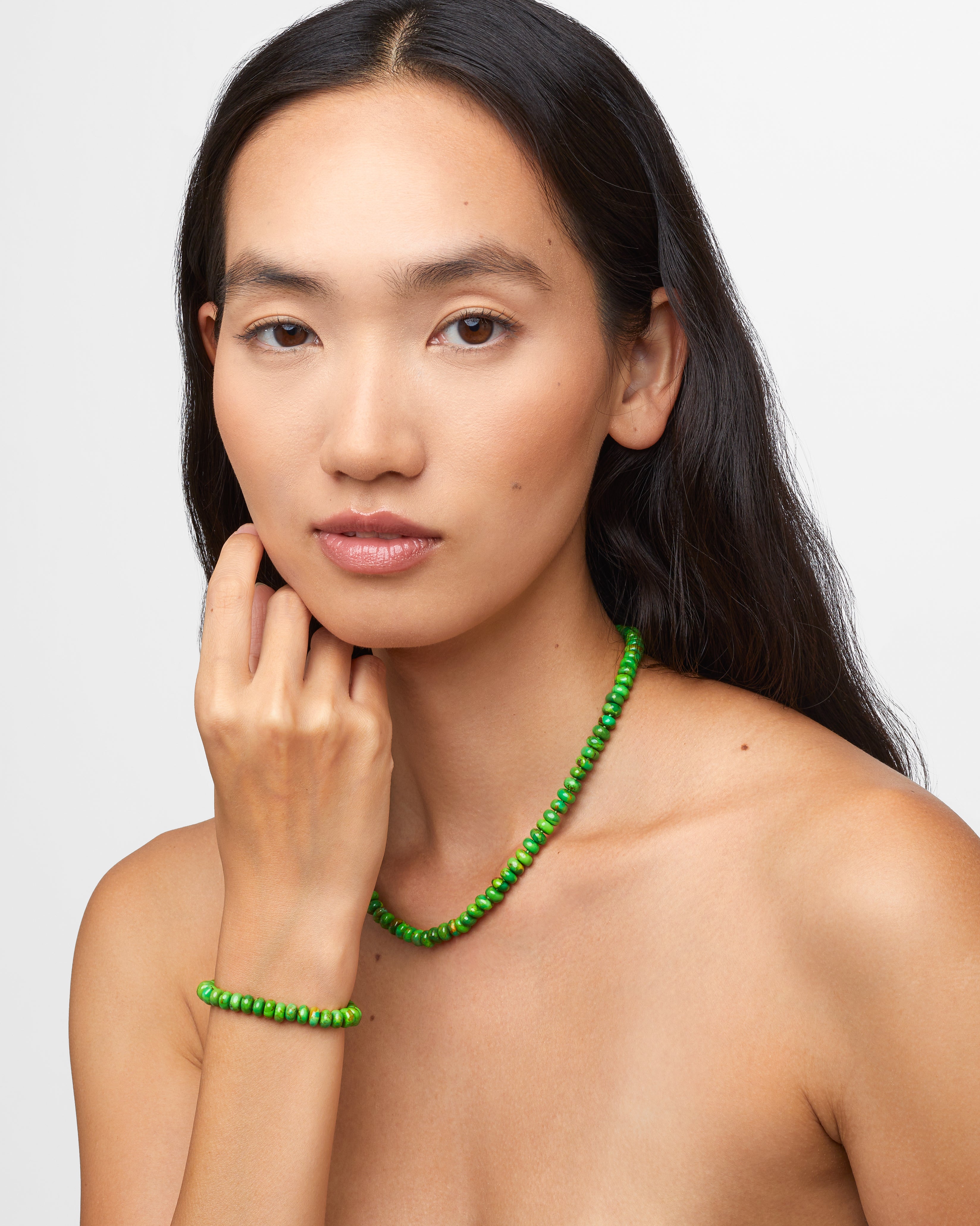 Beautiful and natural green kingman turquoise hand strung in New York City. Yes, this color of turquoise is naturally green! We love it so much.