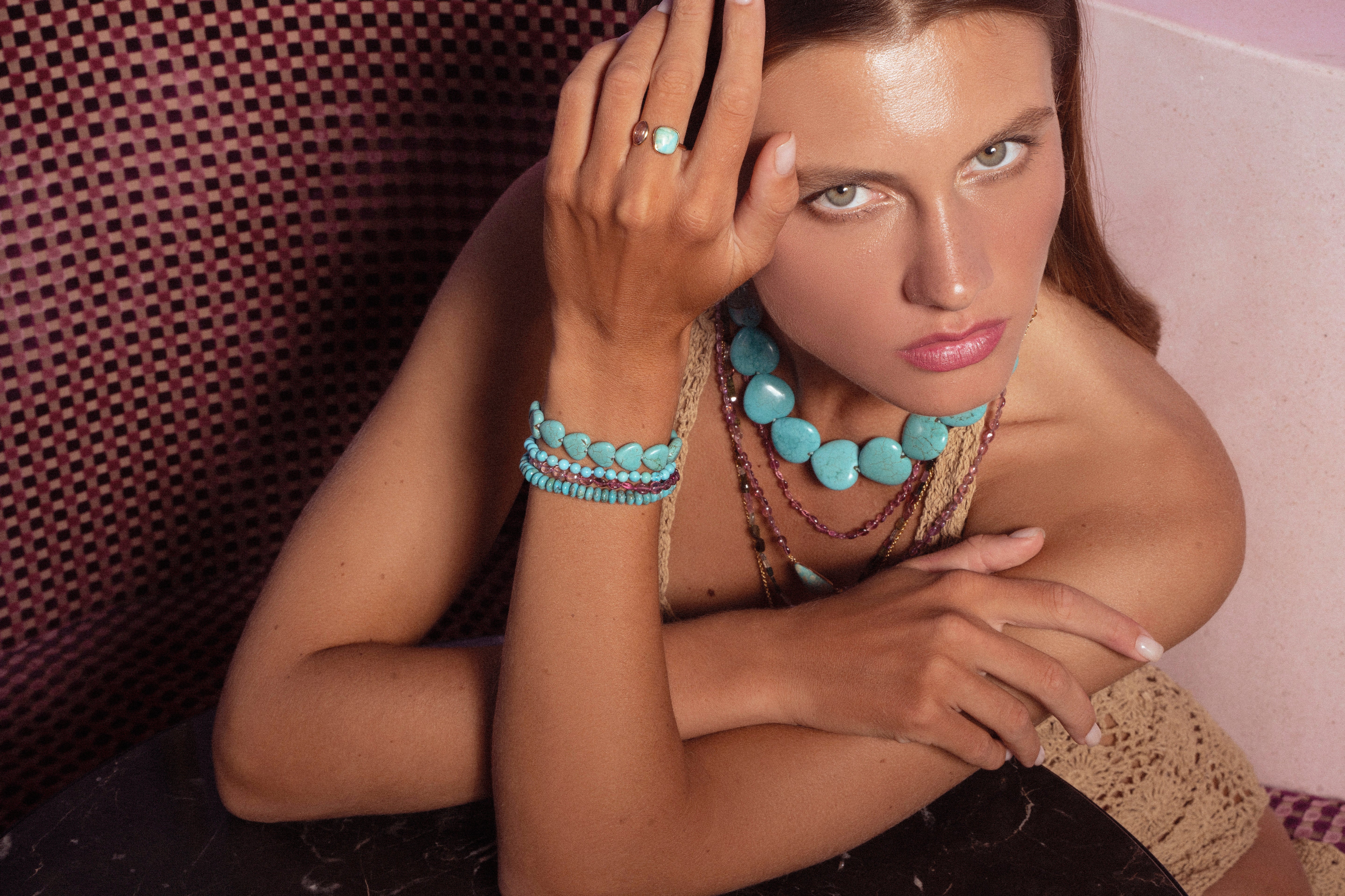 Each beaded jewelry piece is hand strung from the highest quality materials that are cut from natural mineral sources. They are sensitive to prolonged exposure to hairsprays and scents. To ensure longevity please be gentle and avoid tugging and pulling of these pieces.