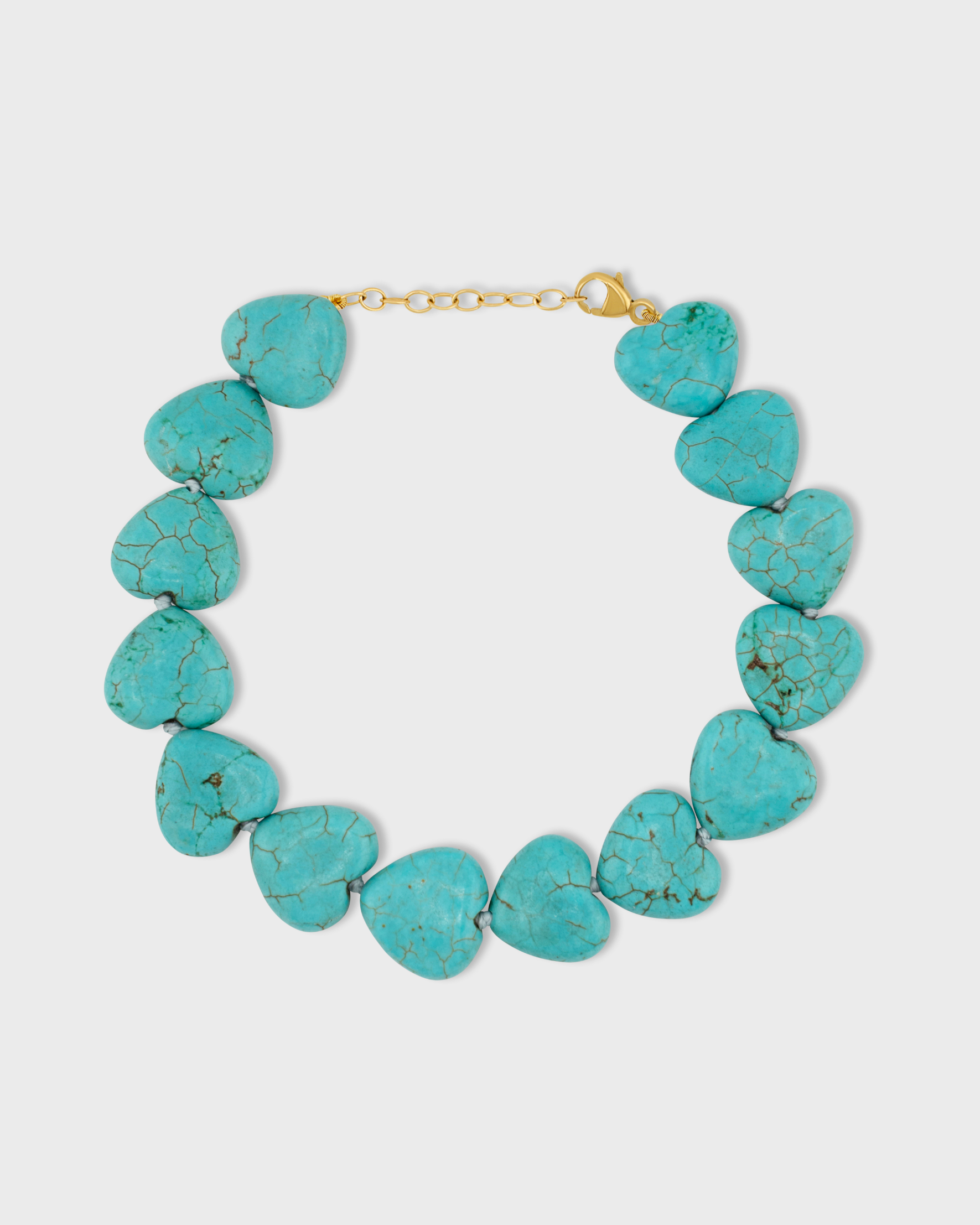 Hand carved turquoise hearts hand strung in New York City and finished with 14 karat yellow gold.