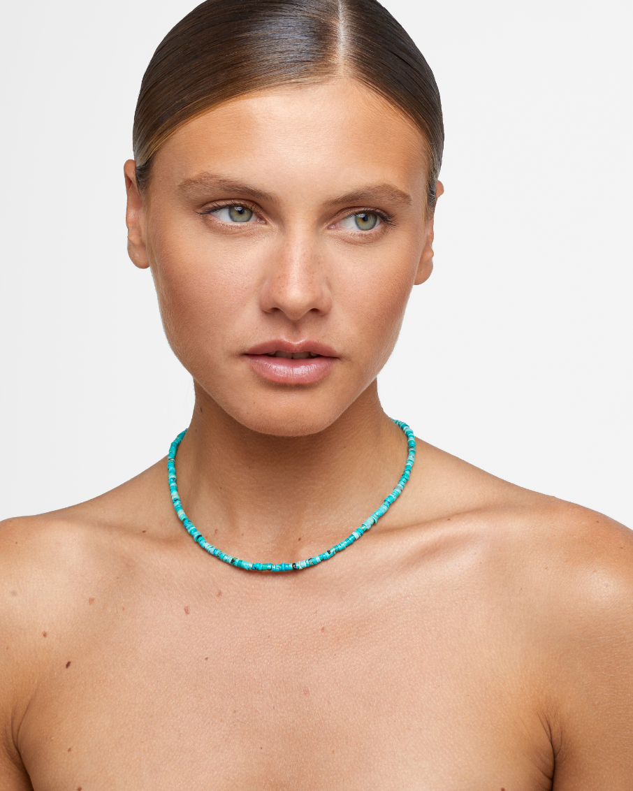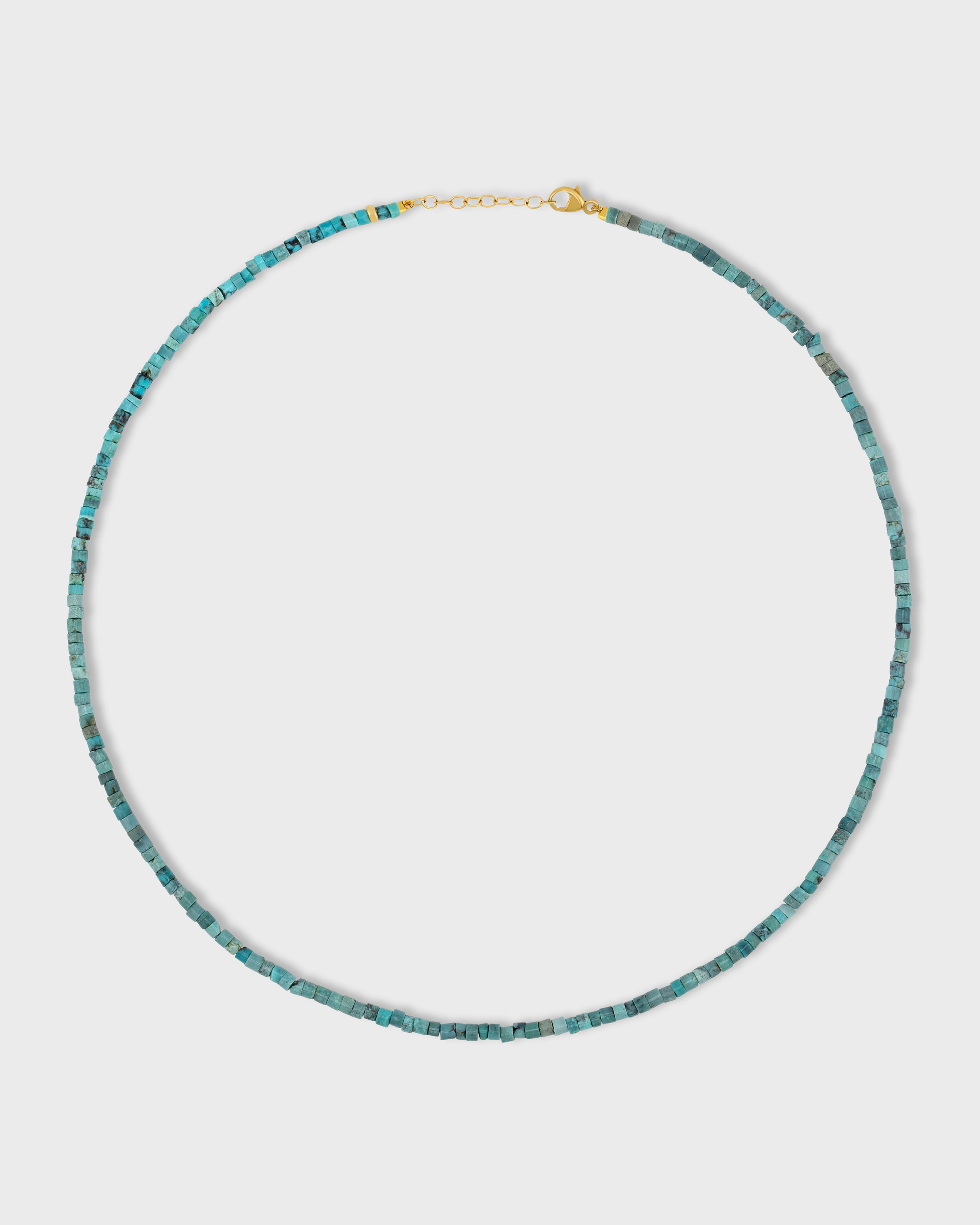 Heishi turquoise hand strung in New York City and finished with 14 karat yellow gold.