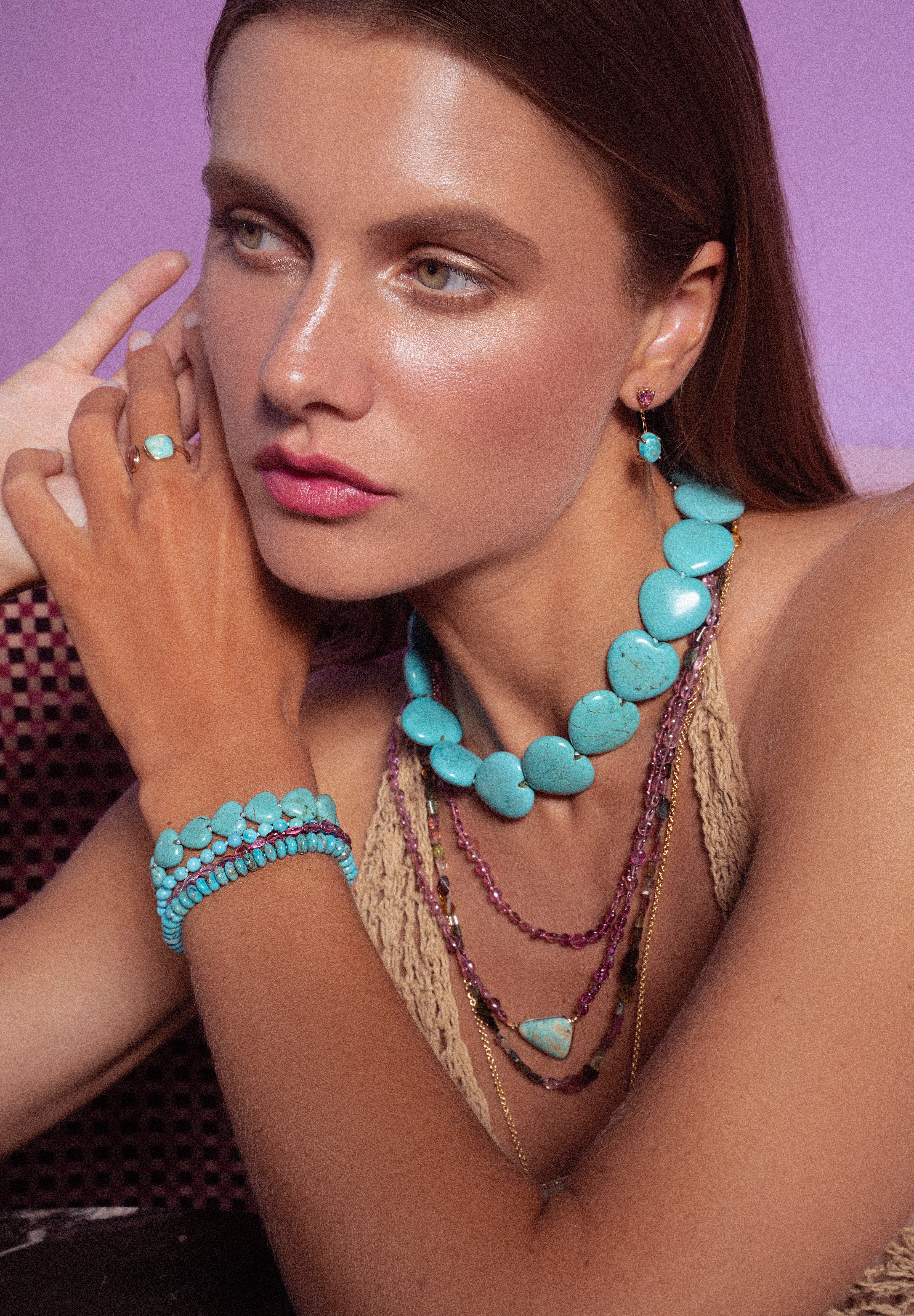 Each beaded jewelry piece is hand strung from the highest quality materials that are cut from natural mineral sources. They are sensitive to prolonged exposure to hairsprays and scents. To ensure longevity please be gentle and avoid tugging and pulling of these pieces.