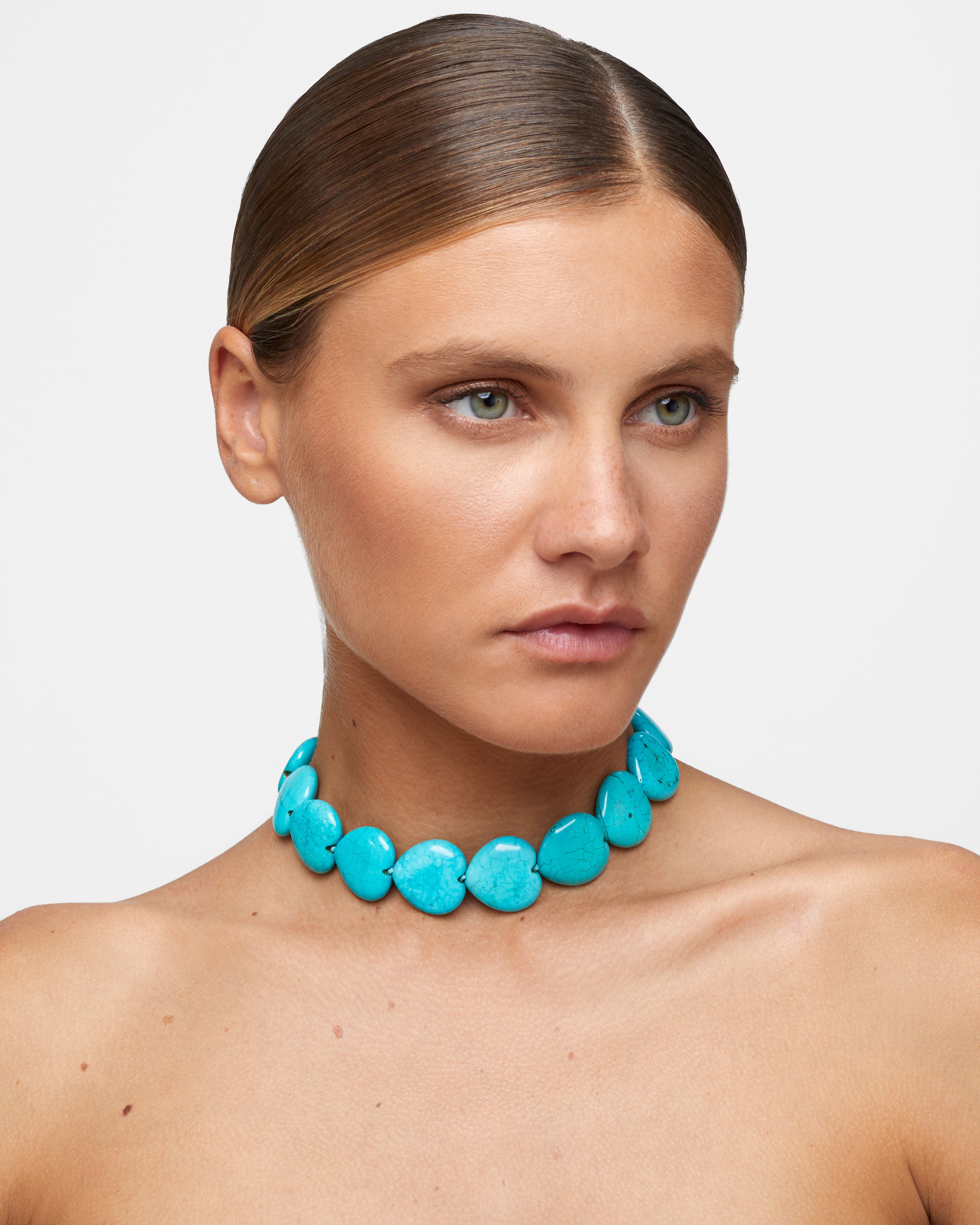 Bright blue natural jumbo turquoise hearts hand strung in New York City and finished with 14 karat gold. Turquoise is a beautiful shade of blue and is known for its calming properties. This necklace is a unique and eye-catching piece that is perfect for a statement look.