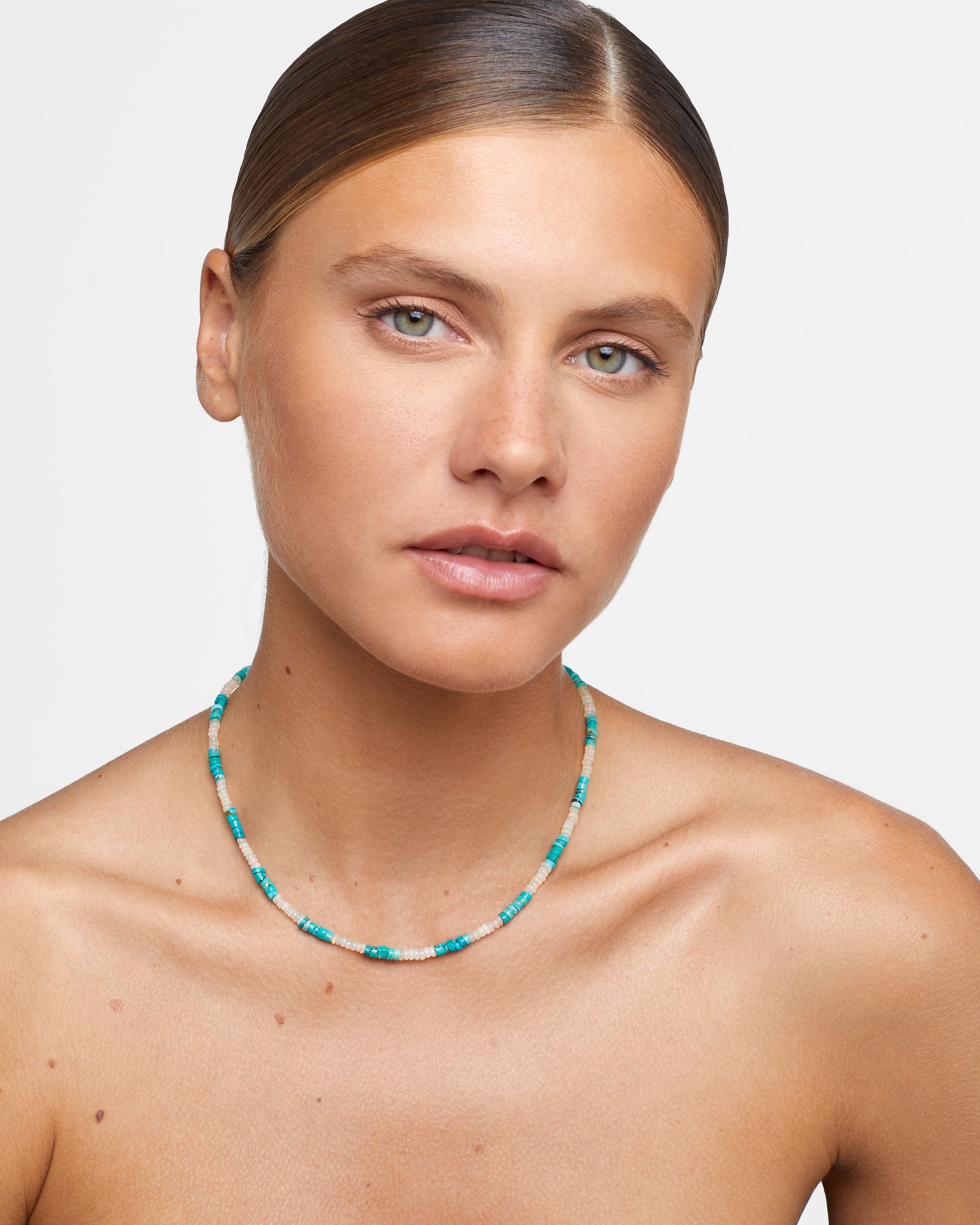 Vibrant blue turquoise and opal hand strung in New York City and finished with 14 karat yellow gold.