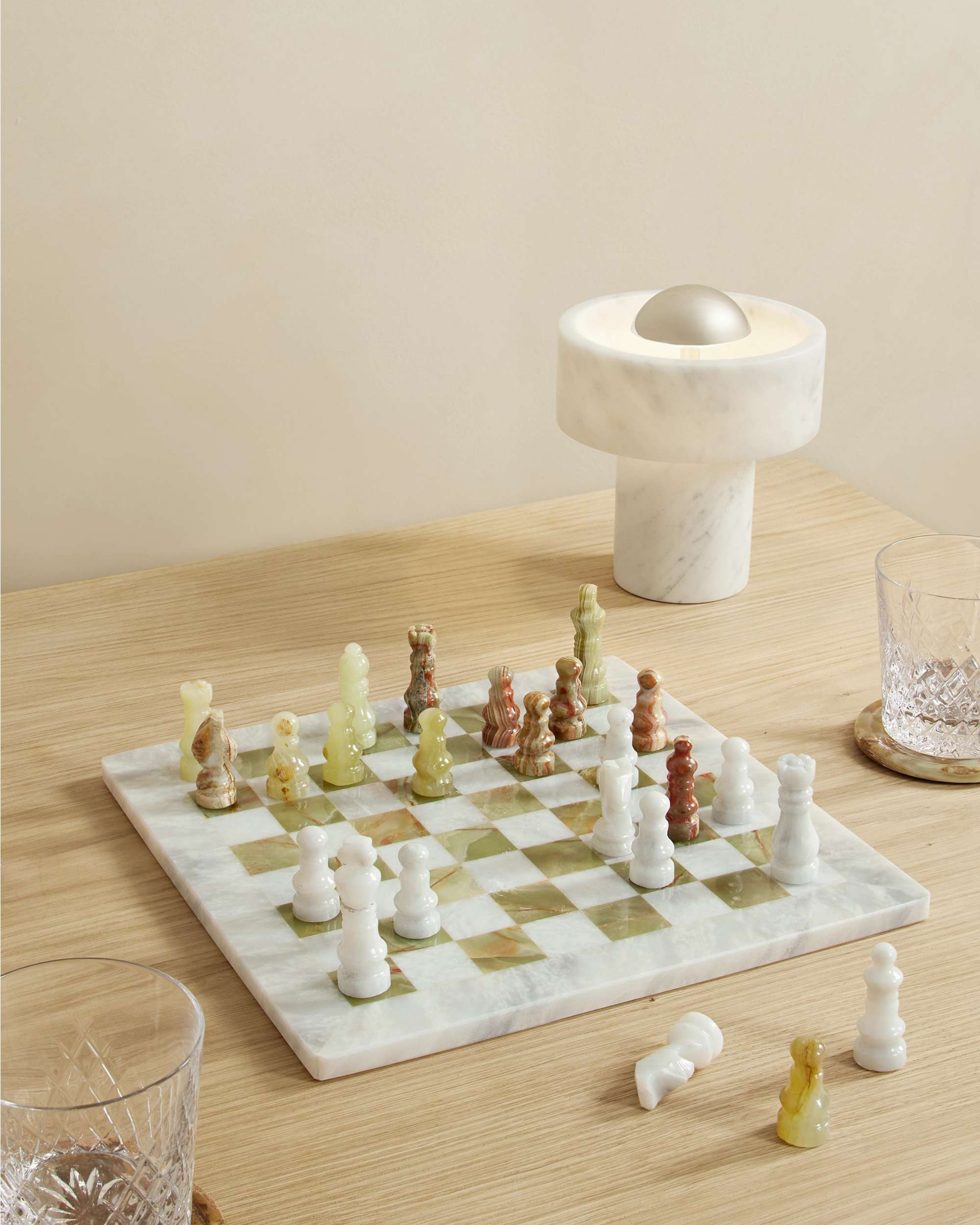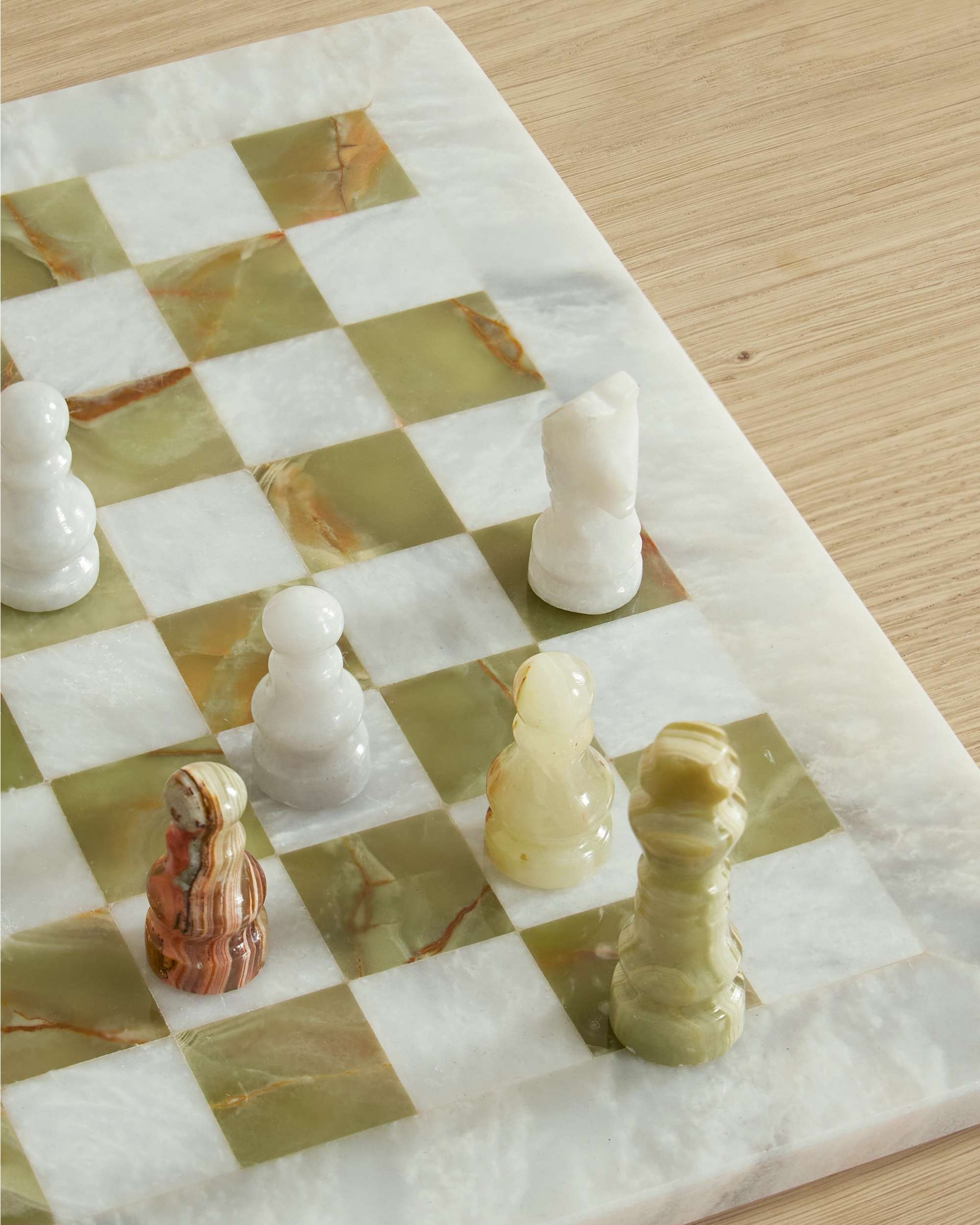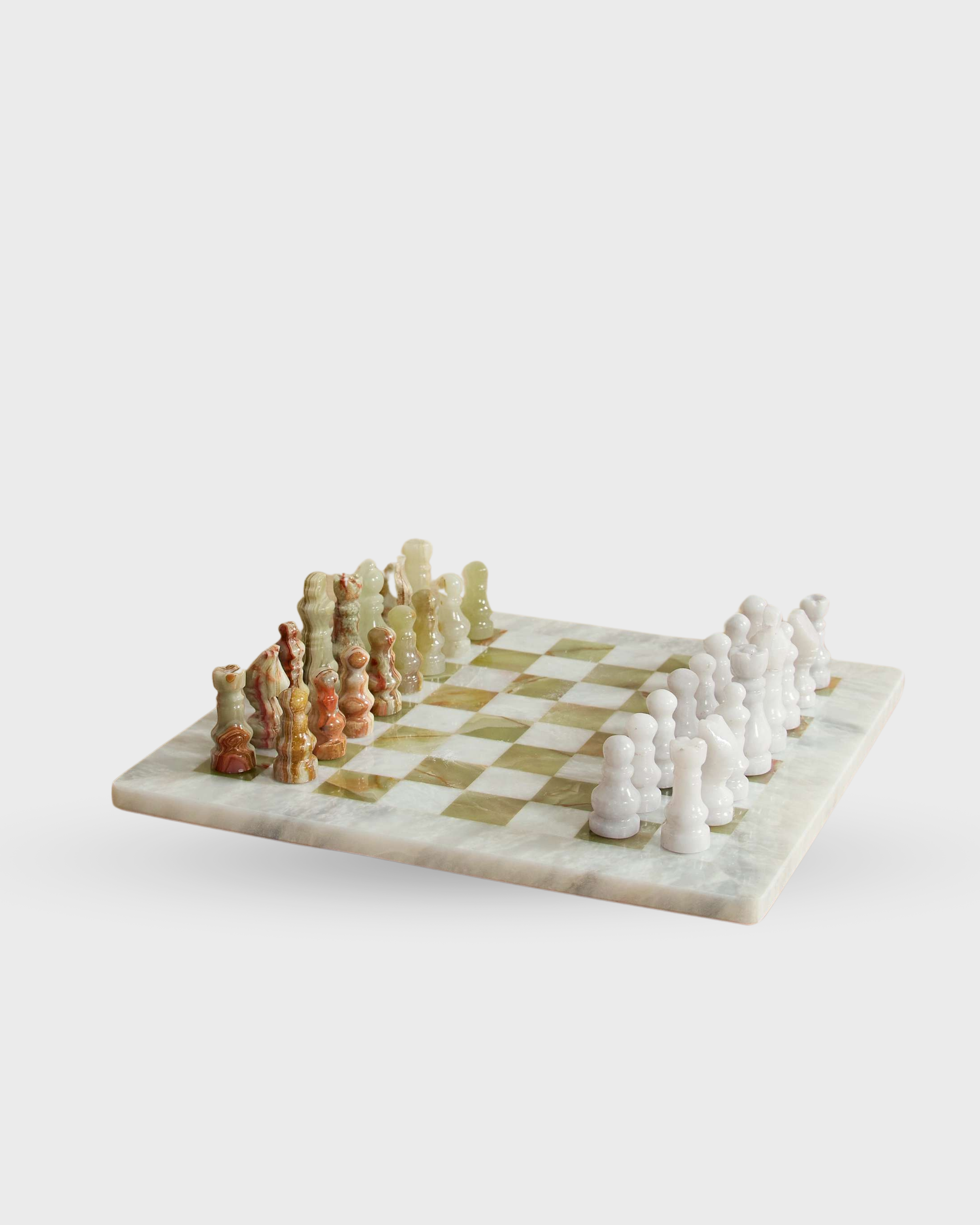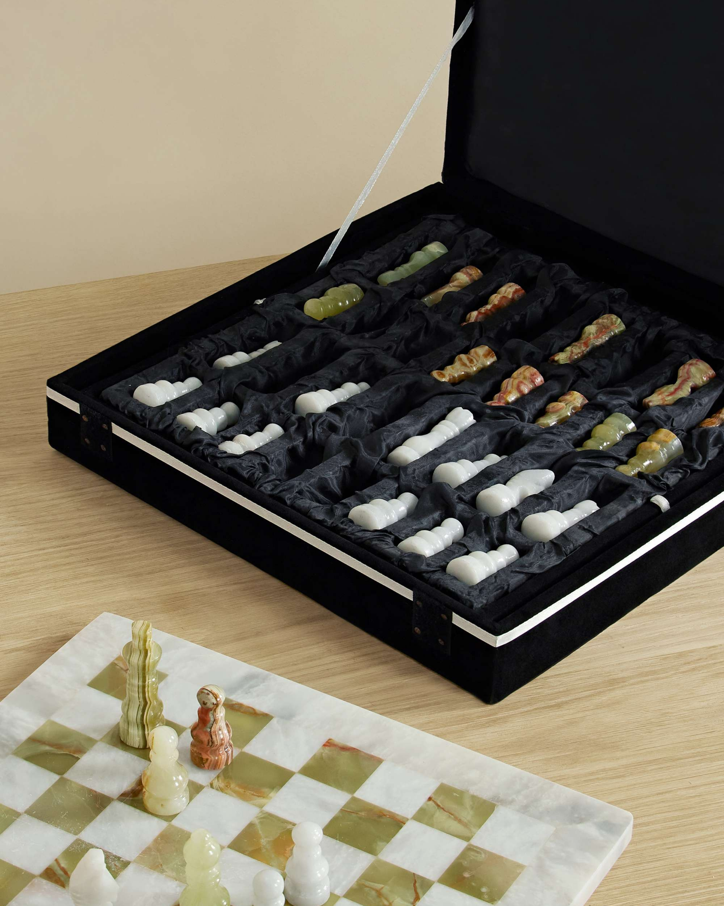 This handcrafted Onyx Chess Set showcases beautifully polished pieces in natural shades of green, white, and earthy tones, creating an elegant and timeless design. Each piece is meticulously carved, offering a unique blend of artistry and functionality. A stunning addition to any space, this chess set is perfect for collectors or those seeking a sophisticated way to enjoy a classic game.