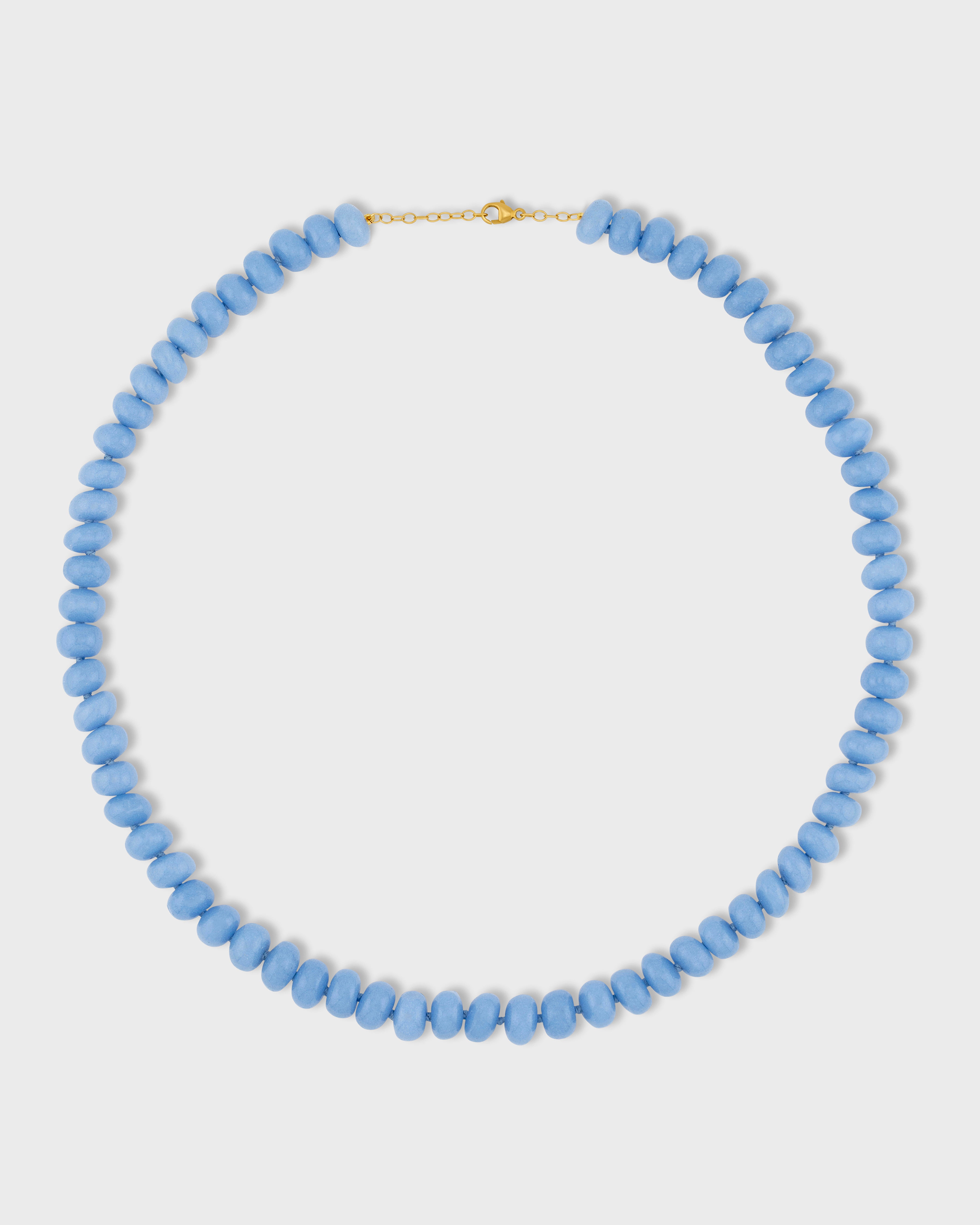 Periwinkle aragonite crystal beads hand strung in the heart of New York City and finished with 14 karat yellow gold.