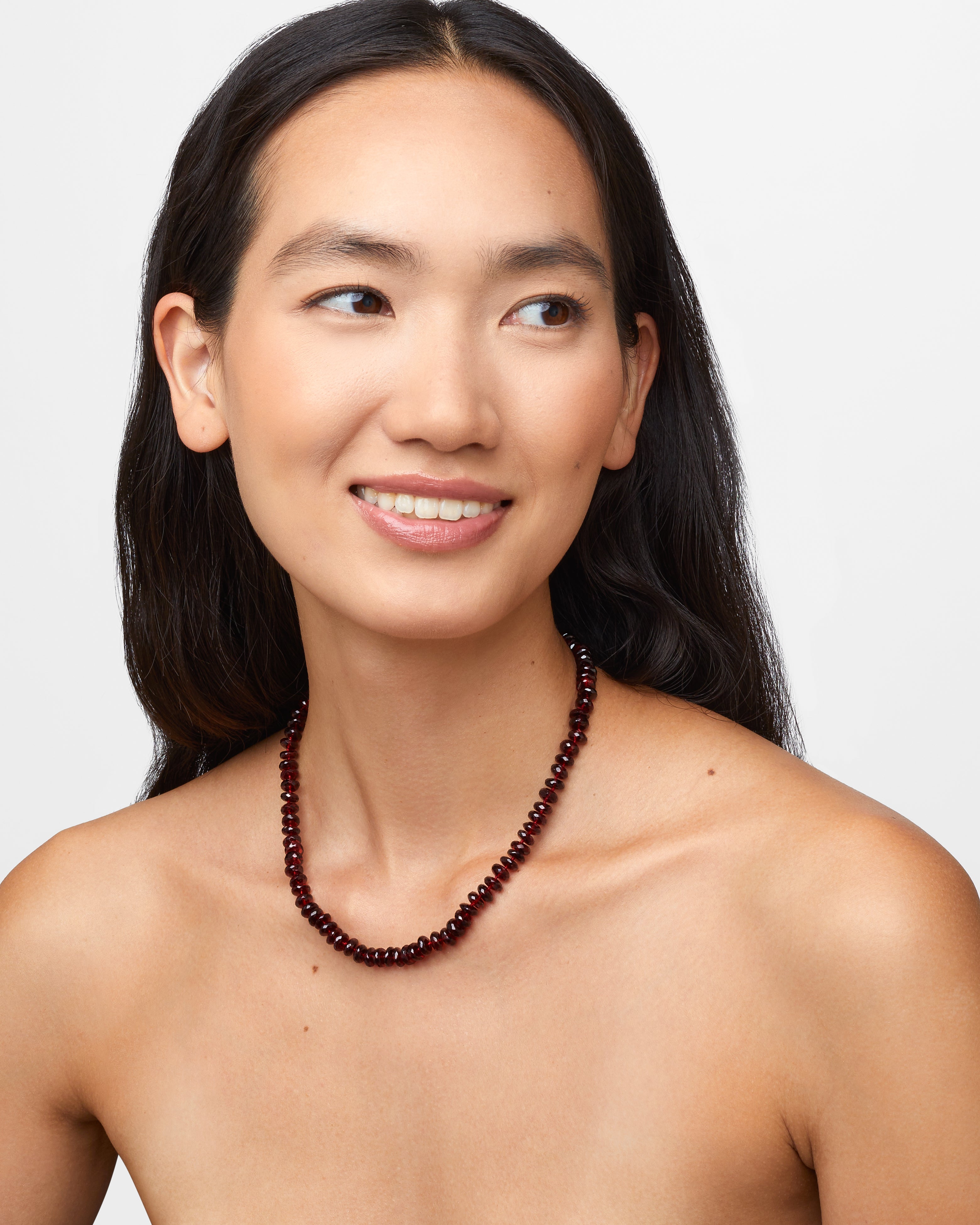 Garnet crystal beads hand strung in the heart of New York City and finished with 14 karat yellow gold.