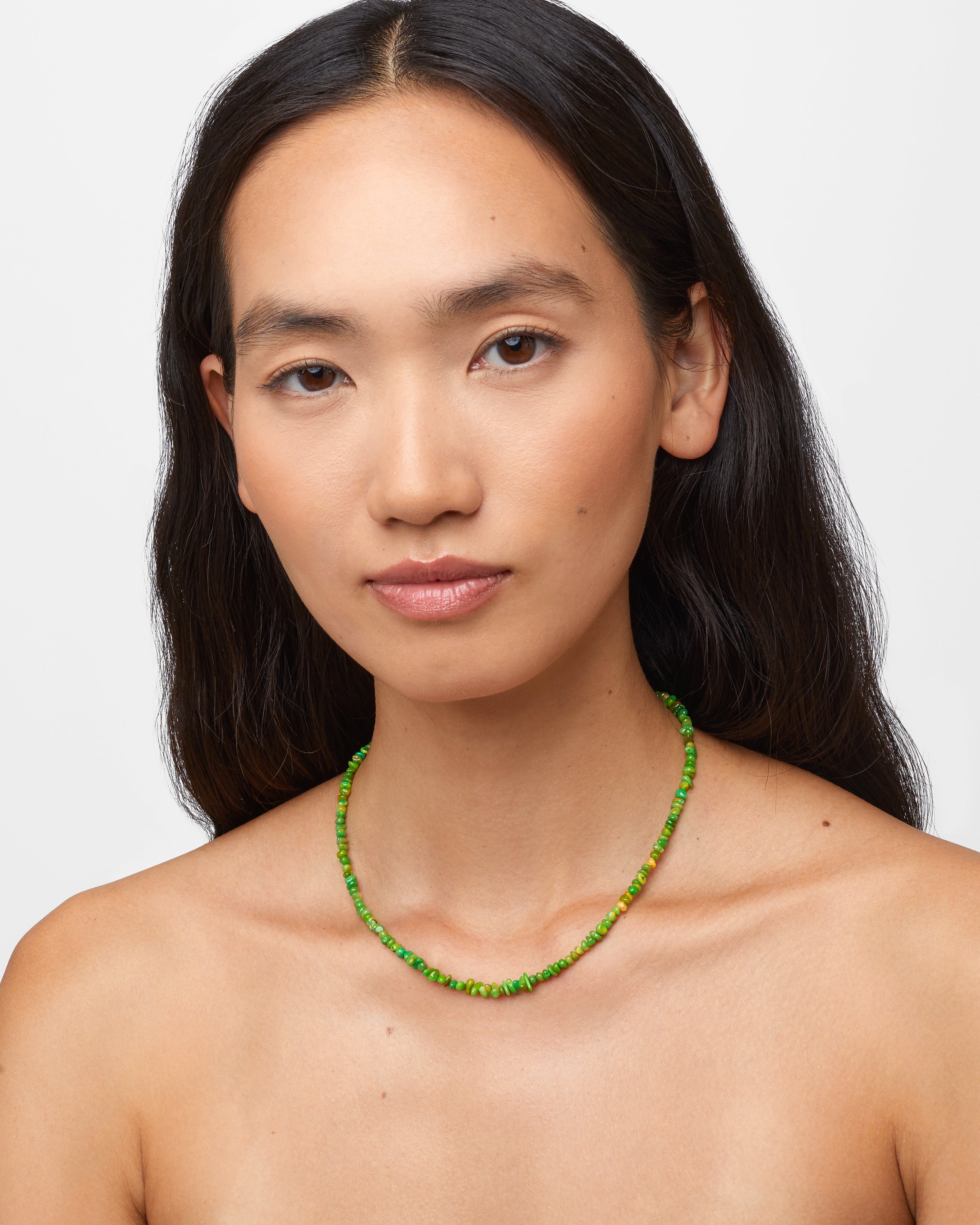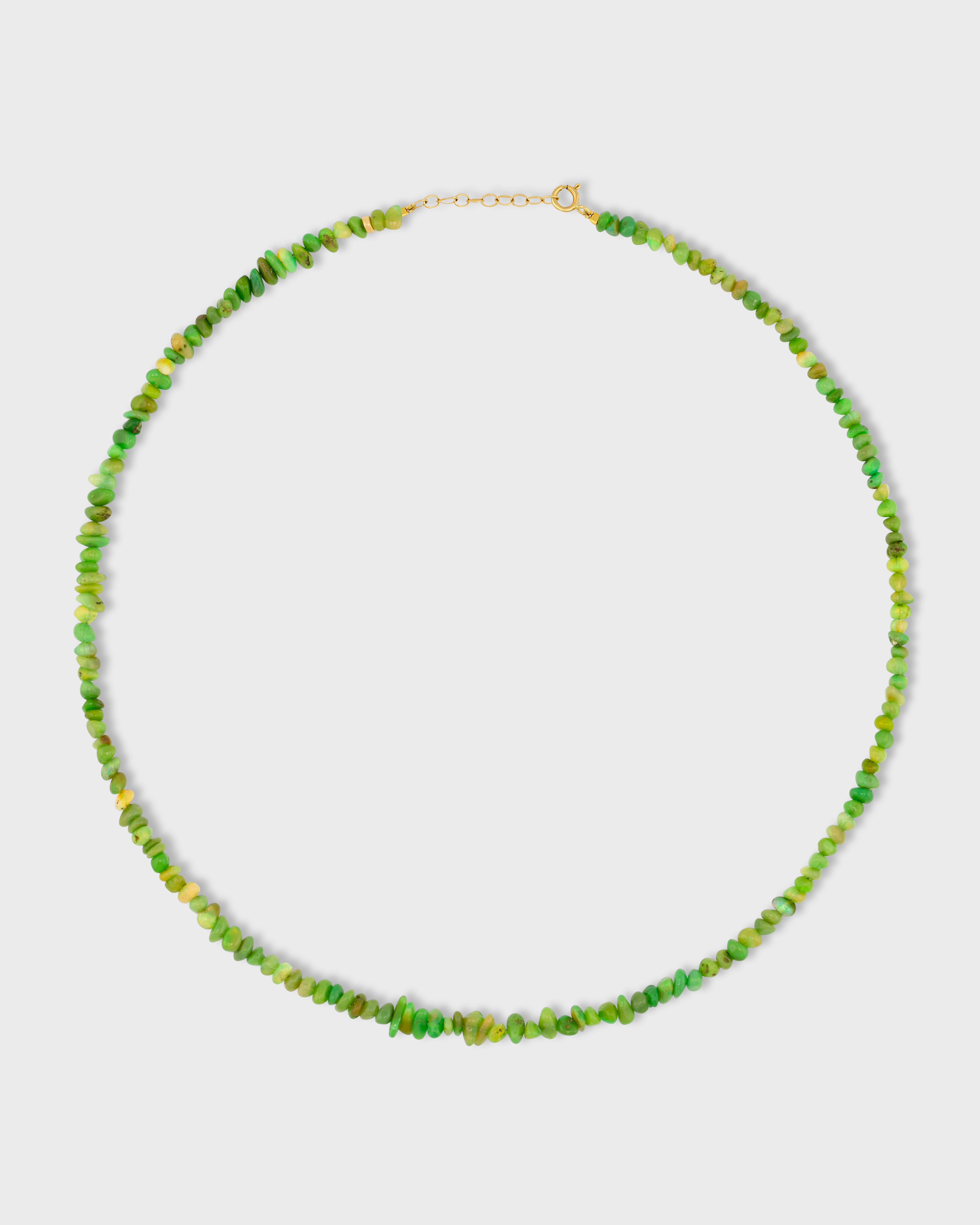 Vibrant mini green opal pebbles hand strung in the heart of New York City and finished with 14 karat yellow gold.