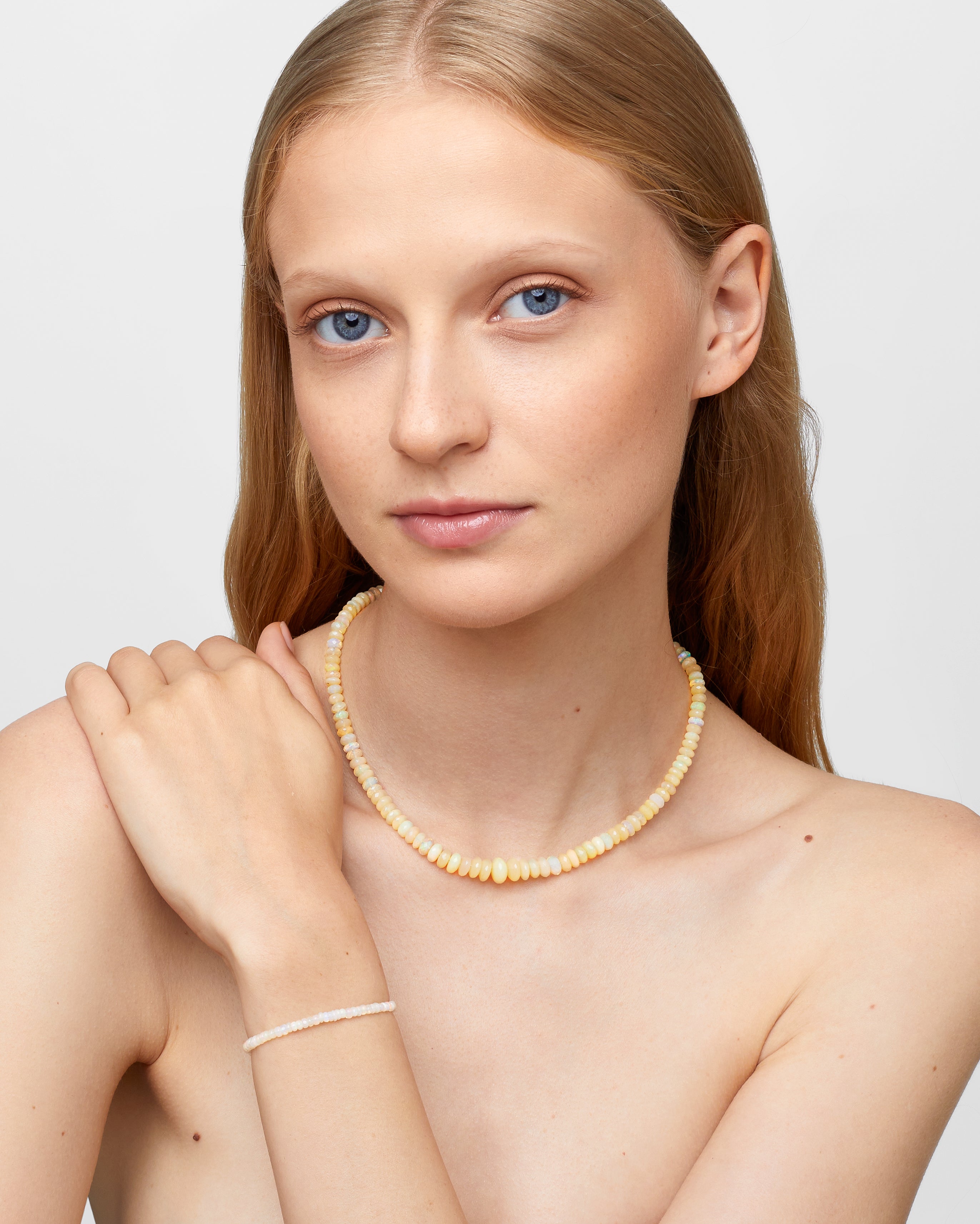 Smooth Ethiopian white opal beads hand strung in New York City and finished with 14 karat yellow gold.