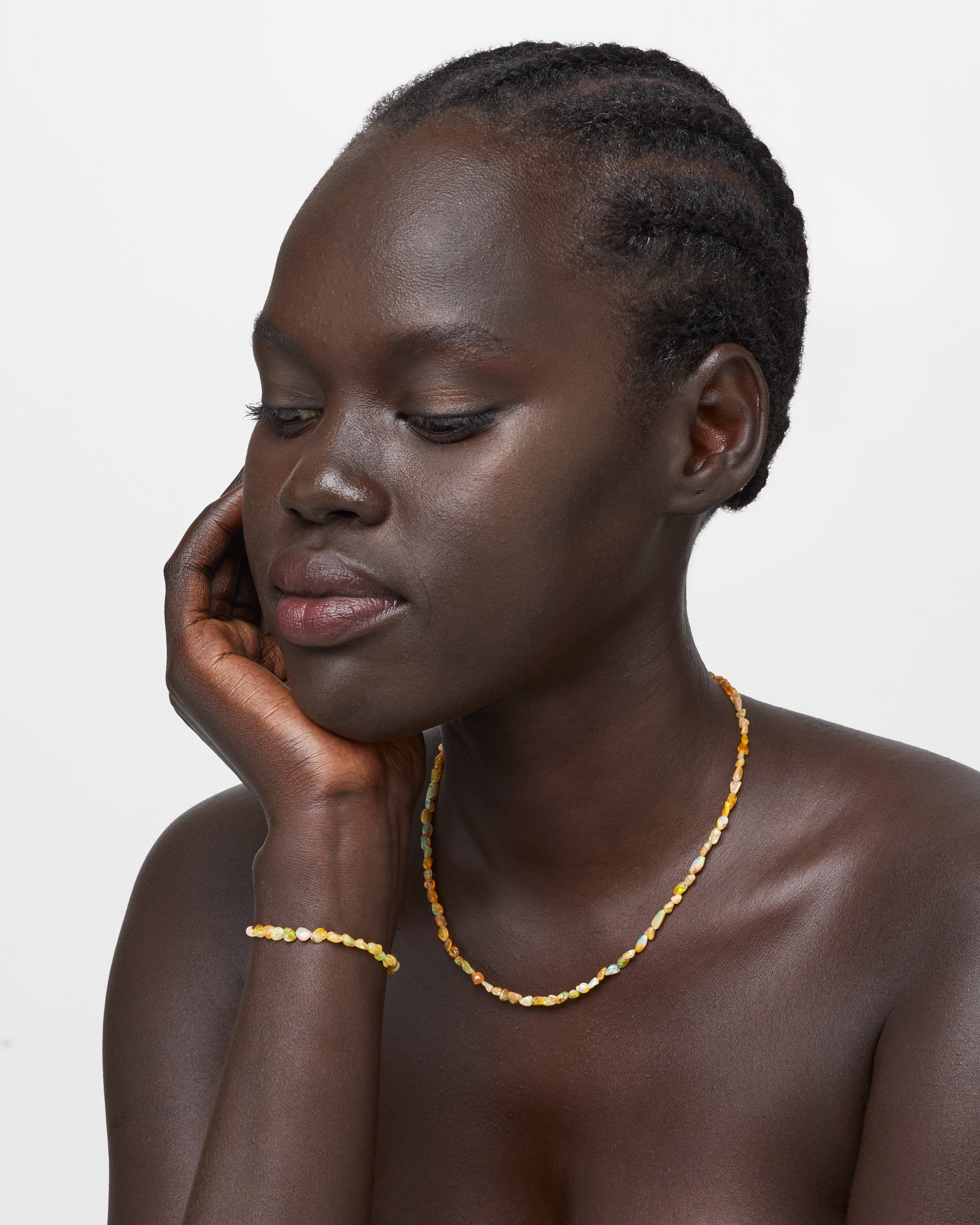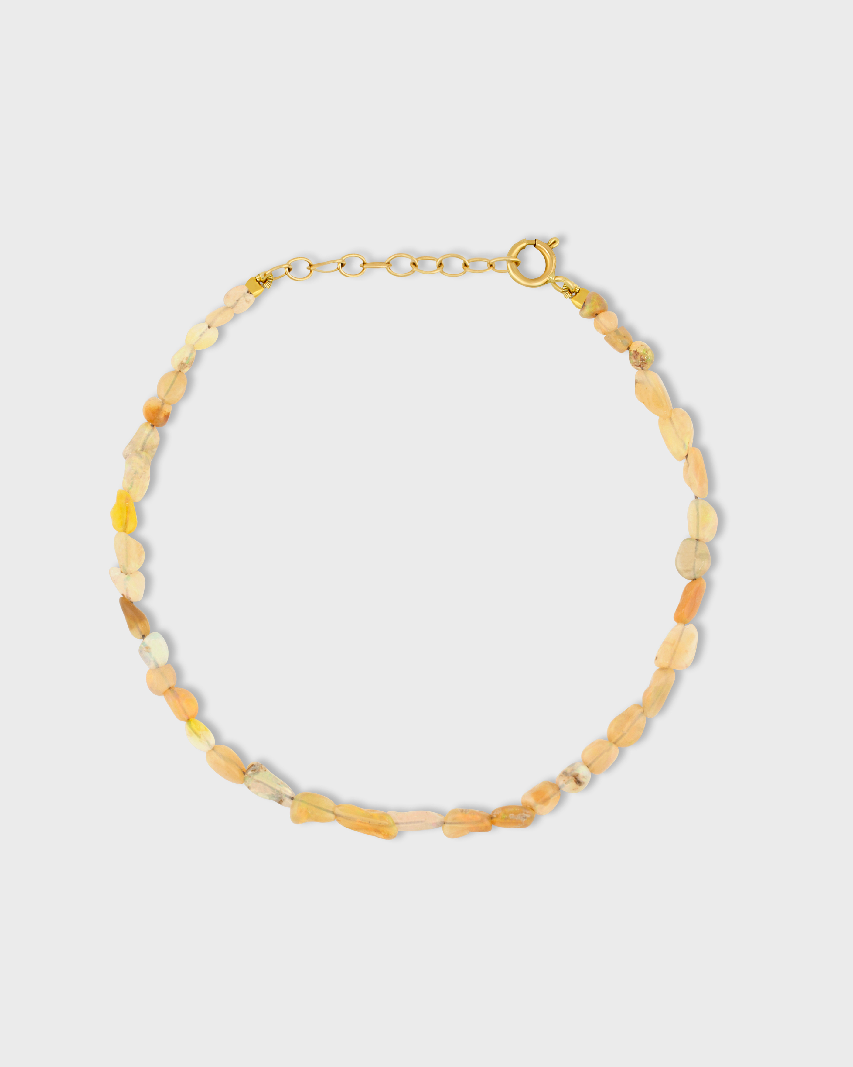 Pebble opal hand strung in New York City and finished with 14 karat yellow gold.