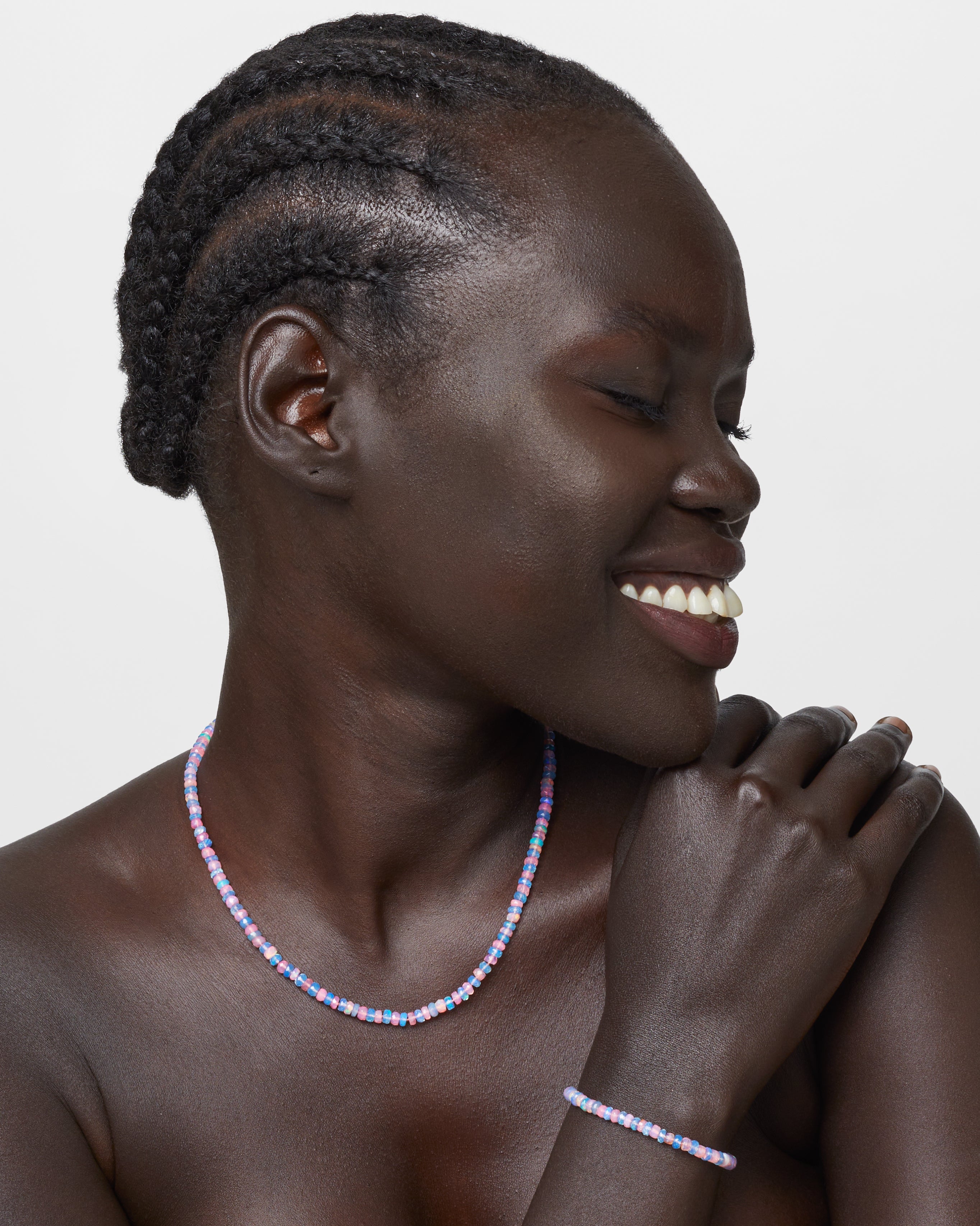 Each beaded jewelry piece is hand strung from the highest quality materials that are cut from natural mineral sources. They are sensitive to prolonged exposure to hairsprays and scents. To ensure longevity please be gentle and avoid tugging and pulling of these pieces.