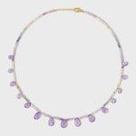 A delicate design with pastel sapphires and soft pink amethyst drops, this necklace captures an ethereal and serene aesthetic. The subtle hues of the gemstones together with the gold setting create a refined and calming look.