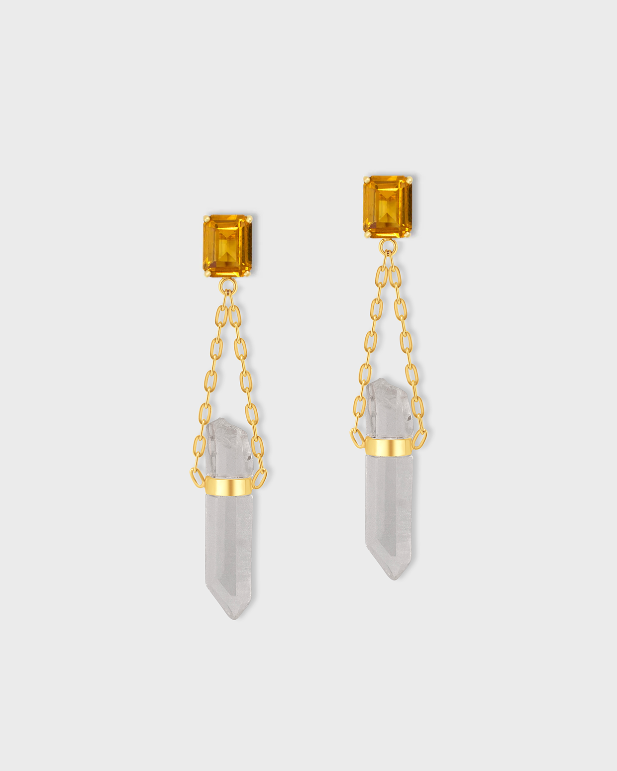 Amethyst emerald cut gemstones paired back to raw natural crystal quartz all is custom hand set in 14 karat gold.