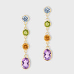 Stunning multi gemstones in rich, oval cuts dangle gracefully from a delicate gold chain, radiating warmth and depth. These earrings are an ideal accessory for those looking to add a touch of luxury and timeless style to their ensemble.