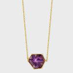 This unique necklace features a hexagon-shaped amethyst gemstone suspended from a delicate 14k gold chain. Amethysts are known for their beautiful purple hues and are believed to stimulate the third eye chakra, which is associated with intuition and wisdom. The geometric cut of the stone adds a modern touch to the piece. This necklace is handcrafted in NYC and is a perfect everyday piece that adds a touch of spiritual significance and geometric intrigue to any outfit.