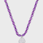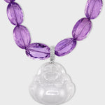 The Happy Buddha Purple Jade Amethyst Necklace features a joyful jade Buddha pendant, symbolizing peace and abundance, paired with striking amethyst beads that promote calm and healing. The design is accented with diamond details, adding an elegant and serene touch to this uplifting piece.