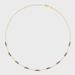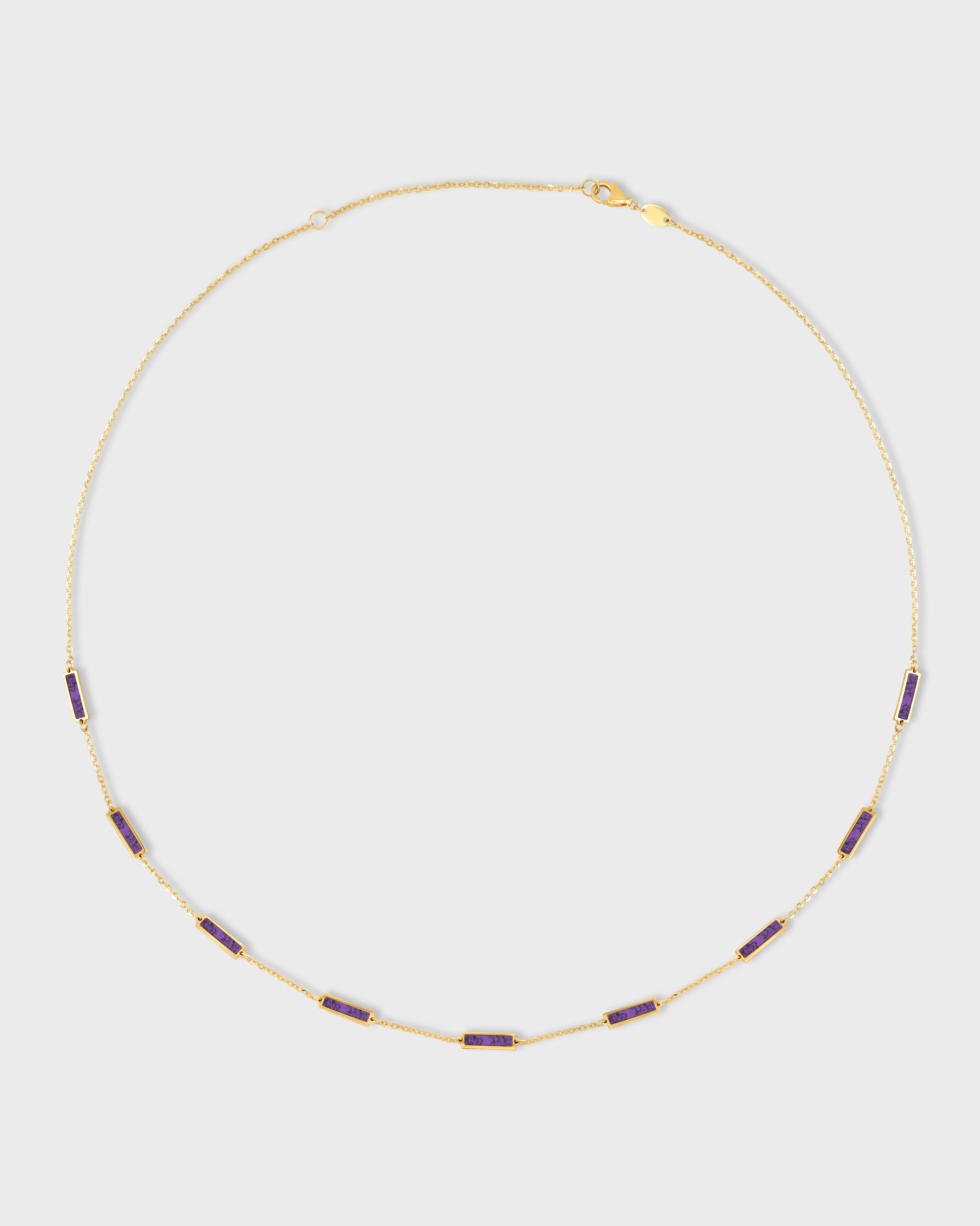 This refined piece incorporates a delicate chain linking the amethyst bars, creating a harmonious balance between the warm golden hue and deep purple accents.